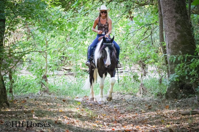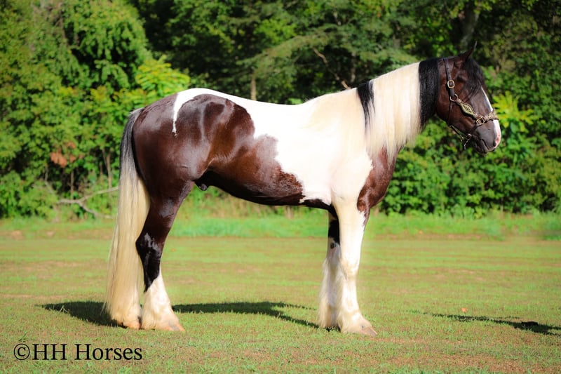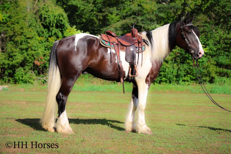 ONLINE AUCTION Place your bids at www.PlatinumEquineAuction.com Starting Bid $3500 Auction ends September 14th, 2025 Need a new saddle? Check out White Rock Saddles on our website or Facebook This is “BIG N’ RICH”, a very stout, extra flashy, super fancy moving, GYPSY VANNER SPOTTED DRAFT CROSSBRED gelding that is broke to ride and drive. He stands 16 hands tall and is 4 years old. He is broke to work double or single and has pulled hay wagons, pumpkin patch wagons, and been hooked to all farm machinery. He has pulled a cart and carriage through holiday parades. He has been in heavy traffic and lots of commotion with no issues. He is a superb trail mount that will go anywhere you point him, willingly and steadily. He is sure footed through very rocky and steep terrain and he takes his time down rough embankments and up and down the rugged trails. He is a love bug on the ground and will soak up all the attention you will give him. He lopes nice circles, catches his leads, stops easily, and backs up. He has been shown in lead line with novice riders. He has excellent ground manners, stands tied, loads, bathes, and hauls with no fuss. Located in Flemingsburg, KY. Contact Erin with HH Horses 304-238-4155 with any questions or to make a Buy It Now Offer. ONLINE AUCTION Place your bids at www.PlatinumEquineAuction.com Starting Bid $3500 Auction ends September 14th, 2025 Need a new saddle? Check out White Rock Saddles on our website or Facebook