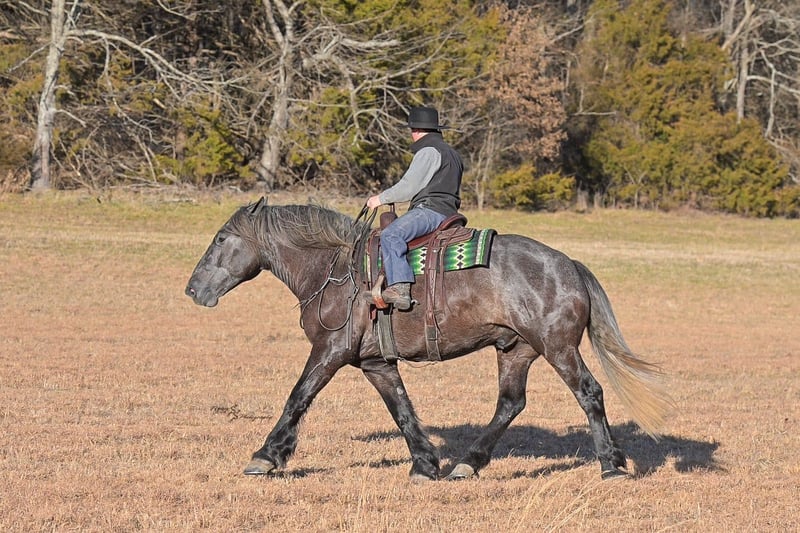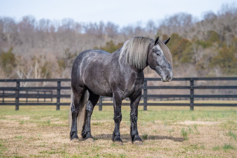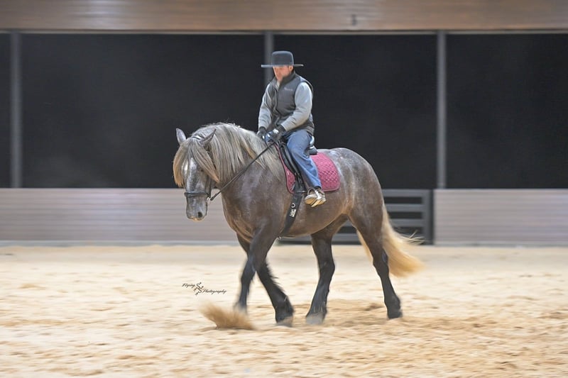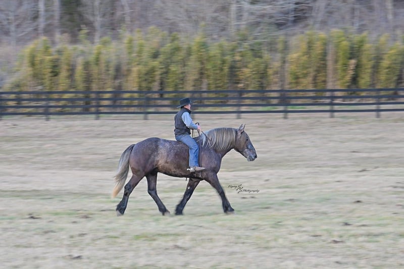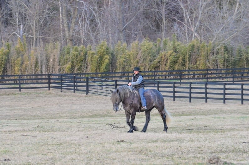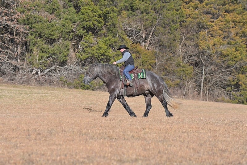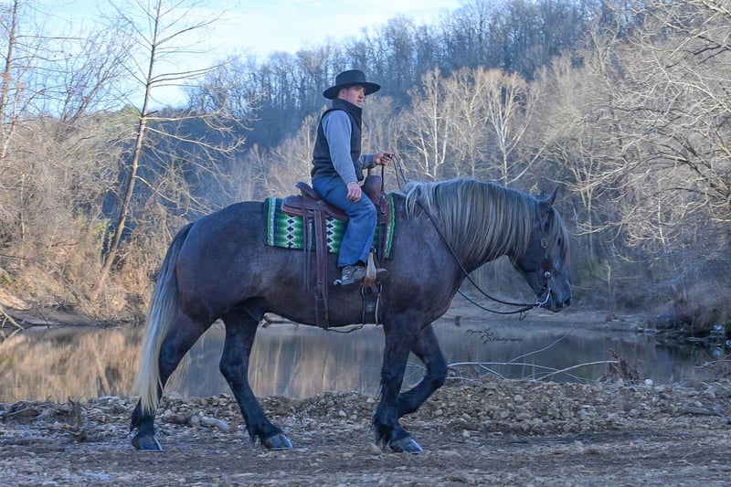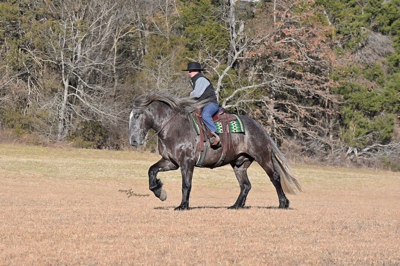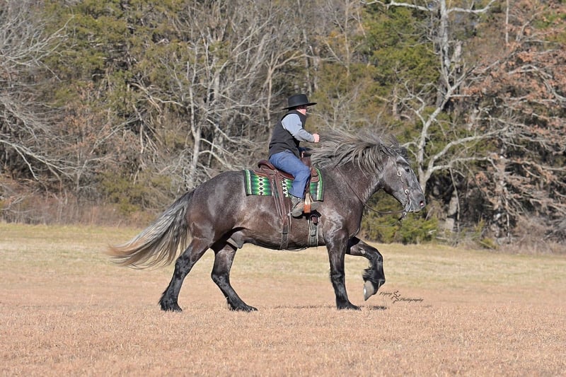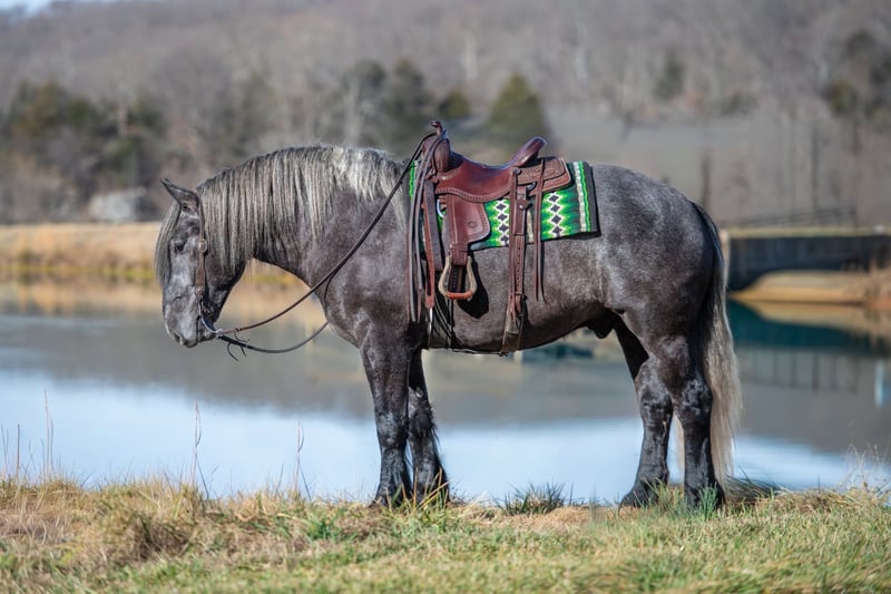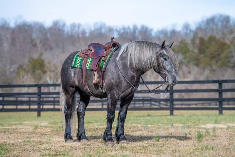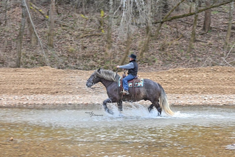 "AVAILABLE ON ONLINE HORSE AUCTION AT www DOT PlatinumEquineAuction DOT com BIDDING OPEN NOW thru SUNDAY | APRIL 12TH! *Final price will be determined on auction site* CONSIGNOR CONTACT INFO: Edwin Raber 319-283-0616 LOCATION: Fairbank, IA Keystone is the definition of a gentle giant and is the perfect gentleman whether his rider is big or small. He is a 5 year old draft cross gelding that stands a solid 16.2h, weighing in at 1500 lbs, and wearing a #6 draft shoe. He is honest and genuine in his ride, taking care of an inexperienced or a young rider as they stroll down the trails. Keystone is a jack of all trades; he rides Western, English, bareback, bridleless, and even drives! You can expect him to be a seasoned trail or arena mount, even with time off, he picks things up right where you left off. He is a pleasure to be around on the ground, under saddle, or under harness. Keystone will go wherever he is pointed down the trails, where he easily crosses downed timber, walks quietly through the rivers, and handles rugged terrain with ease. He is accustomed to all wildlife as well, whether he comes across a flying pheasant in Iowa, or a speedy road runner in Arkansas; Keystone has seen it all! Whether you are out on the trails or in the arena, he stands patiently at a mounting block or will even stand next to a rock or log to be mounted. He is truly a horse that an entire family can enjoy, and is so versatile. He has a personality that everyone loves, as he enjoys all of the attention. He is personable with everyone and doesn't know a stranger. You will notice in his photos and video that he has a true double mane, falling thick and even on both sides of his neck! He is truly one of a kind. Keystone has put up with a lot from me as you will see in the video, always keeping a level head and the utmost patience. He stands quietly with side-by-sides doing donuts around him, and even entertains attention from a 7.5ft T-Rex on the ground and under saddle. He handles new things like a seasoned pro, and it's one of our favorite things about him. Keystone picks up his leads correctly on cue, lopes beautiful circles in a field or in the arena. He does everything that is asked of him without hesitation. Even with new riders on his back, he is always aiming to please. For a crossbred gelding, there isn't much that Keystone hasn't done, or hasn't been exposed to. He is extremely well rounded and versatile, making him a great fit for so many riders and families. All of our video was taken while on vacation in Arkansas, a brand-new place to him. Though it is not in the video, we want to emphasize how well he drives and how well he handles riding through the busy streets of our small town. Keystone is traffic safe, and handles a busy environment very well. He is not a stranger to trail obstacles; and enjoys all of the horseplay with the tarps, balls, and anything else the kids can think of. Keystone loads and hauls very well, he is a gentleman for the farrier and the veterinarian, bathes well, and stands quietly to be groomed and tacked up. He is used to being around farm equipment and all types of farm animals from small pets to poultry. He is easy to catch and happy whether he is stalled or turned out, and gets along well with others in a pasture setting. Radiographs or a pre-purchase exam can be arranged (at buyers expense). If you have any questions or would like to meet Keystone prior to the auction ending, please CALL Edwin at 319-283-0616.