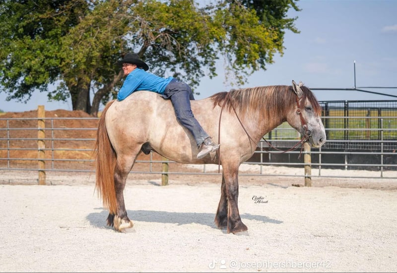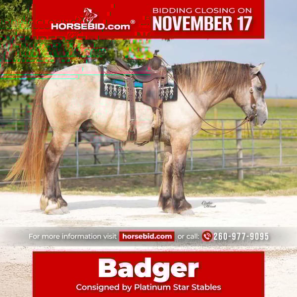 🎲𝓽𝓱𝓮 𝐑𝐈𝐃𝐄𝐑'𝐒 𝓒𝓱𝓸𝓲𝓬𝓮🎲 Happening now thru MONDAY | NOVEMBER 17th - Available EXCLUSIVELY on HorseBid's website! For more details and to register visit: www.Horsebid.com CONSIGNOR CONTACT: Platinum Star Stables 260-977-9095 LOCATION: Independence, Iowa BREED: Draft Cross REGISTERED: No COLOR: Grulla Roan HEIGHT: 17 AGE: 4 GENDER: Gelding Badger is a stout built, 16.1hh, just turning 5 year old, grey draftcross gelding. He has been ridden every where that you could ask one to go… Lots of outside miles, down the trails, across the creeks, ditches, deadfall… he does it all! He handles any obstacles that are in his way, is safe to ride down the highways and through town as well. He rides well in the arena and does fine in a group as well as alone. He neckreins around nice, takes his leads, lopes nice circles and has a good stop. Badger is a great size that will fit any level of rider, right down to the youngest ones yet he is stout enough to carry any adult. He is the friendliest horse that you will ever meet and loves attention. He is farrier friendly, he tacks up quietly and walks right off when asked after he is mounted. He has been around lots of kids and loves attention and is easy to catch as well. He absolutely does not buck, bite or kick as he is totally safe and well trained. In addtion to riding Badger also drives very well, whether in the field, down the highways or through town. Badger is blemish free, has had all of his shots, and has been dewormed. He sells 100% sound and sane. We invite anyone to come see and ride him in person so they can understand how truly awesome that he is! Located in Independence, IA. Contact Ervin with Platinum Star Stables 260-977-9095 with any questions.