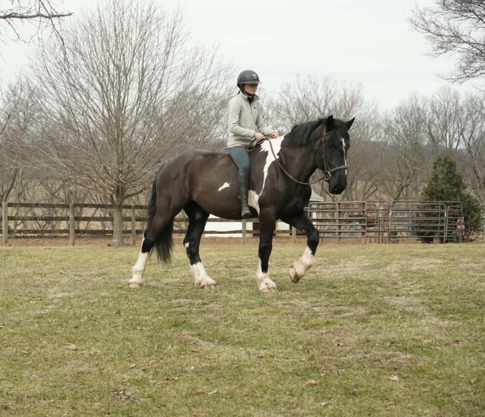 🌟𝑨𝒑𝒓𝒊𝒍 𝐀𝐋𝐋 𝐒𝐓𝐀𝐑 𝐋𝐈𝐍𝐄𝐔𝐏🌟 Happening now thru MONDAY | APRIL 6th - Available EXCLUSIVELY on HorseBid's website! For more details and to register visit: www.Horsebid.com CONSIGNOR CONTACT: S. Morgan Baugher 240-660-0550 LOCATION: Tuscarora, MD BREED: American Spotted Draft Horse REGISTERED: No COLOR: Pinto HEIGHT: 17 AGE: 5 GENDER: Gelding “On Cloud Nine” “Cloud” is a 17.0hh, 5 year old American Spotted Draft horse. He’s handsome, loving, and a joy to ride. From the moment you lay eyes on him, you will understand how special he is. You will gain confidence with having a steady and dependable partner. He’s a real steady-eddy type - not spooky and takes everything in stride. With Cloud’s size and easygoing temperament, he can be enjoyed by riders of all ages and levels of experience. Whatever job you ask of him, he always does it willingly and sensibly. Horses with Cloud’s temperament and versatility do not come along often. This is your chance to get a truly special horse to enjoy for decades to come. Cloud is smooth and comfortable to ride. He is more woah than go but has all the buttons to pick up the pace when asked. He is very balanced and uphill, so you can ride along for hours comfortably. He is a true confidence builder, good for newer or nervous riders. He also is stunning to look at, with feathered feet and flashy paint coloring. He turns heads wherever he goes. Cloud has been ridden English, Western, bareback, and double, and he is game for anything, anytime. Cloud is very seasoned on the trails, in the ring, and out on the town. He is calm and levelheaded no matter the situation. He has crossed bridges, waded through creeks, traversed logs and ditches, and passed cars on the road, all without hesitation and with a confident attitude. We live next to a gun range and train tracks, so he is desensitized to those noises. He’s been a steady trail partner for riders of all experience levels. He rides out alone or with others. He’s also taught beginner lunge line lessons and carried experienced riders around for dressage lessons. He is the kind of horse you can pull out anytime, put anyone on, and have a blast and feel comfortable with him. He is fully acclimated to the hustle and bustle of a busy farm with heavy equipment, dogs, children, small animals, and traffic around him. Cloud does not mind toy wagons, balloons, flags, or ropes. He is up for any adventure, whether you want to foxhunt, event, take lessons, trail ride, event, show, or just hang out at home. He is patient with new riders and adapts to help his rider advance. He can help you safely reach your goals as a rider. Cloud rides both English and Western, and is responsive to leg, seat, and voice cues. His foundation is rock-solid: knows all his cues, always picks up the correct lead, and knows lateral movements. He has three smooth, adjustable gaits and jumps over fillers and natural obstacles. He has a soft mouth and consistently offers a pleasant disposition. He is good for kids, beginners, husbands, etc. Cloud is the same horse whether you ride him every day or once a week. He does not need a strict program. What makes him a standout is his patience and dependability. Cloud could go in absolutely any direction - from a fancy trail horse to a mounted patrol horse, therapy horse, ranch partner, fox hunter or hill topper, or dressage mount. On the ground, Cloud is very sweet and cuddly. Never pushy but enjoys attention and wants to be with you. He loves getting brushed, having his hair braided, and being told how handsome he is. He would probably come in your house and watch a movie with you if he could. He partakes in family trail rides, family snow day adventures, and trips into town. Cloud is also exceptionally well behaved around the barn. He is stands for the vet and farrier. He picks up all four feet with ease and is good for bathing, clipping, and all the barn activities. He stands quietly in cross ties until you are ready to ride. He happily lives in or out. He loads and hauls exceptionally well and is sensible in new environments (see him walking through Tractor Supply). No maintenance or supplements. He’s an easygoing and low-maintenance kind of guy. He is a real heartthrob. This is the family-friendly wunderkind that people spend years searching for. We can help with shipping anywhere. PPE's Welcome. Watch His Video and contact Morgan for any additional questions.