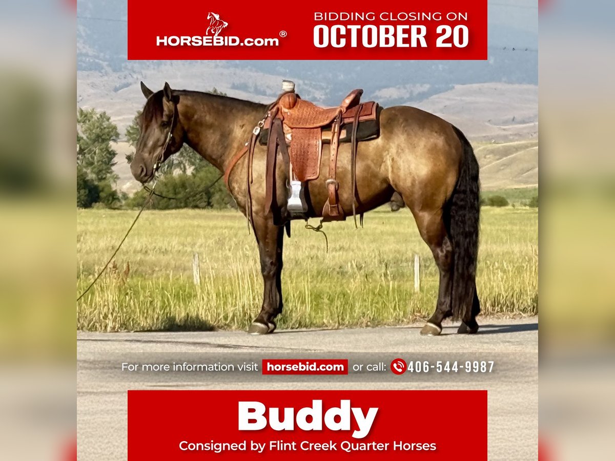 ♦️ 𝐭𝐡𝐞 𝐀𝐌𝐄𝐑𝐈𝐂𝐀𝐍 𝓕𝓪𝓵𝓵 𝓒𝓵𝓪𝓼𝓼𝓲𝓬 ♦️ Happening now thru MONDAY | OCTOBER 20th - Available EXCLUSIVELY on HorseBid's website! For more details and to register visit: www.Horsebid.com CONSIGNOR CONTACT: Flint Creek Quarter Horses 406-544-9987 LOCATION: Drummond MT BREED: Crossbred Quarter Horse REGISTERED: No COLOR: Buckskin/ Seal Brown HEIGHT: 14.3 AGE: 5 GENDER: Gelding Buddy is a 5 yr old crossbred grade quarter horse gelding that stands 14.3 hands. He is dark buckskin in the summer months and dark seal brown in the winter. He is a very friendly gentle guy that anyone that knows how to ride could get along with. He has been a ranch and trail horse his whole life doing all the ranch chores like pasture doctoring and pushing cows around. He will pull anything you can latch onto. He has a good one hand, neck rein and has all the proper buttons on him. He will step to his correct leads both directions and will lope nice circles. He will side pass to open and close gates and has a pretty good turnaround. He is trained to let you get on him off of a step or fence, simply Smooch to him and he will side pass over and make it easy for you to get on. He crosses water and all the trail obstacles and is a pleasure to ride outside. he is not buddy or barn sour and is use to riding off by himself and is the kind that will go all day and give you everything he’s got. He is a fun little gelding to ride that is fast walking and snappy when you need him to be but always quiet and gentle. He has absolutely no buck in him and is very easy to bathe, shoe, and haul. He will jump in the trailer with no problem and back out like a gentleman. This is a stout made guy with a lot of shape and bone. He’s got a big thick, wavy mane and a thick tail that drags the ground. this is a very nice young gelding at the start of his career that would make someone a great all around using Horse. Whether you want to take him to hunting camp this fall or back to the ranch, he is safe sound and ready to go to work. he is not an arena show horse by any stretch, but has been a working horse his whole life. If you think Buddy might be a good fit for you, give us a call and come and try him at the ranch. For more info call Tom at 406-544-9987