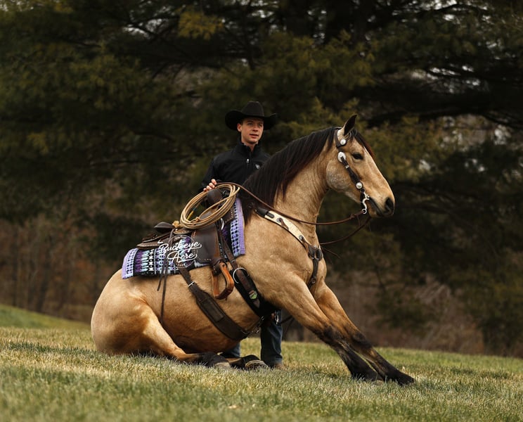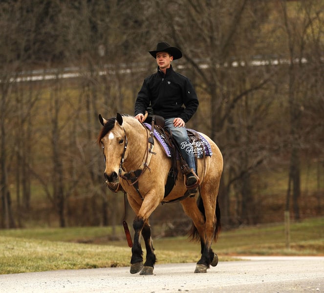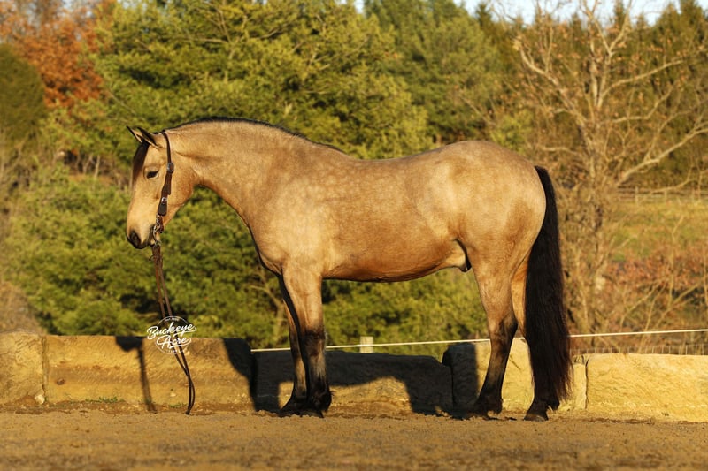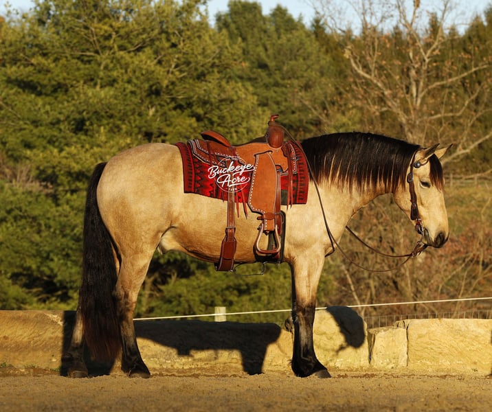 Whew, wow—where do we even begin with Martini? This extraordinary buckskin Draft/Quarter Horse cross is truly a one-of-a-kind package, combining stunning color, perfect confirmation, a gentle personality, and a presence that will win your heart. Born in 2020, Martini stands a strong 15.1 hands, highlighting a beautiful, dappled buckskin coat, a long, flowing mane and tail, four striking black socks, and a small white star centered perfectly on his forehead. Wherever he goes, he turns heads—whether it is in the pasture or out on the trail. Martini is not just a pretty face—he is a true gentleman with a heart as big as his presence. His personality is kind, patient, and eager to please, making him a joy to be around in the barn, pasture, or arena. He has an exceptionally good “must feel” and smooth, enjoyable gaits that you can sit in all day without even noticing you are riding—making every ride an effortless and relaxing experience. Versatility is one of Martini’s strongest qualities. He has been ridden Western, English, and bareback, and can side-pass with ease. He takes jugs, whips, and tarps in stride without hesitation and adapts to any situation with confidence and calmness. From state roads with traffic to checking cows on the ranch, and from exploring miles of trails through woods, over logs, and across streams, Martini never misses a beat. He is as comfortable in the indoor arena as he is in the great outdoors, always maintaining his composure and willingness to work. Martini is also incredibly safe for riders of all levels—whether you are a beginner, a senior, or an advanced rider, he will take care of you and make every ride enjoyable. He shines as a reliable and easygoing partner off the saddle as well. He is a gentleman in the barn and pasture, always the first to greet you at the gate, and he is excellent with farrier visits, wash bay routines, and general handling. He does not require daily rides to stay consistent in manners, attitude, or performance, making him an ideal mount for busy owners or those looking for a horse with no maintenance needs. On top of his personality and experience, Martini has all the practicalities covered: he is up to date on vaccinations, deworming, and shoeing, and has proven to be sound, healthy, and dependable. His combination of beauty, brains, heart, and versatility makes him equally suited for trail riding, ranch work, casual pleasure riding, or showing in a variety of disciplines. If you have been searching for a horse that combines stunning looks, smooth gaits, kind temperament, and a lifetime of experience, Martini might just be the one. He is more than a horse, he’s a partner, a friend, and a trusted companion ready to create memories for years to come. Reach out to Duane at 330-231-2324 to learn more or schedule a visit to meet this amazing horse in person.