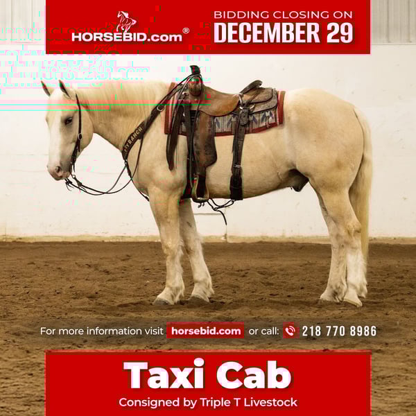 ⚜️ 𝓗𝓮𝓻𝓲𝓽𝓪𝓰𝓮 𝐖𝐢𝐧𝐭𝐞𝐫 𝓒𝓵𝓪𝓼𝓼𝓲𝓬⚜️ Happening now thru MONDAY | DECEMBER 29th - Available EXCLUSIVELY on HorseBid's website! For more details and to register visit: www.Horsebid.com CONSIGNOR CONTACT: Triple T Livestock 218 770 8986 LOCATION: Nevis, MN BREED: Draft Cross REGISTERED: No REGISTERED NAME: Taxi Cab COLOR: Palomino HEIGHT: 16 AGE: 5 GENDER: Gelding Taxi Cab is a hard-to-find 16-hand draft cross gelding with eye-catching palomino color and a bold blaze that makes him stand out wherever he goes. At five years old and weighing around 1,400 lbs, he has the size, bone, and presence people search for in a big, versatile gelding. He is broke to both ride and drive, offering excellent versatility for a variety of homes and jobs. Under saddle, Taxi Cab is a smooth, comfortable mover with an easy, balanced jog and a soft, smooth lope that’s enjoyable to sit. Taxi Cab is traffic safe, confident around commotion, and takes new situations in stride. He rides bareback, handles tarps quietly, and stays level-headed whether you’re in the arena, out on the trail, or around busy environments. His draft cross build gives him a solid, secure feel that riders appreciate. If you’re looking for a young, good-minded big gelding that’s broke and versatile, Taxi Cab checks those boxes.