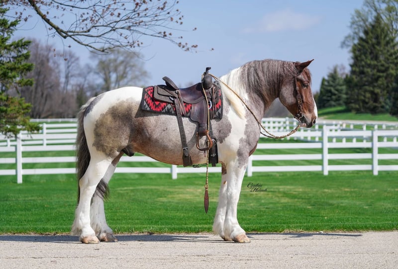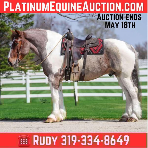 ONLINE AUCTION Place your bids at www.PlatinumEquineAuction.com Starting Bid $3500 Auction ends May 18th, 2025 Need a new saddle? Check out White Rock Saddles on our website or Facebook! Spirit is a 5 yr old, stunning red roan tobiano, draft cross gelding. He stands a magnificent 16.1 hands tall and weighs 1400 lbs. Spirit is an all around horse, he has done Christmas rides in multiple towns. He will ride out in a group or be great by himself. He crosses water, logs, down the busy highway, good in traffic, trails, been out after dark. Spirit is well trained to ride English or western. He also drives single or double. If you are looking for a horse that is big enough for the adults, and quiet enough for the children, definitely check him out. He has excellent ground manners, easy to catch, groom, bathe, stands good for the farrier, hauls and stalls great! Spirit can be turned out with other horses or stalled by himself. We have truly enjoyed every minute of Spirit and are excited to find him the perfect home where he can continue to shine. Horses like him don’t come around every day! Contact Rudy at R & R Regal Equine: 319-334-8649 to schedule a time to meet him, FaceTime , or just chat more about this once in a a lifetime horse! Located in Independence IA. ONLINE AUCTION Place your bids at www.PlatinumEquineAuction.com Starting Bid $3500 Auction ends May 18th, 2025 Need a new saddle? Check out White Rock Saddles on our website or Facebook!