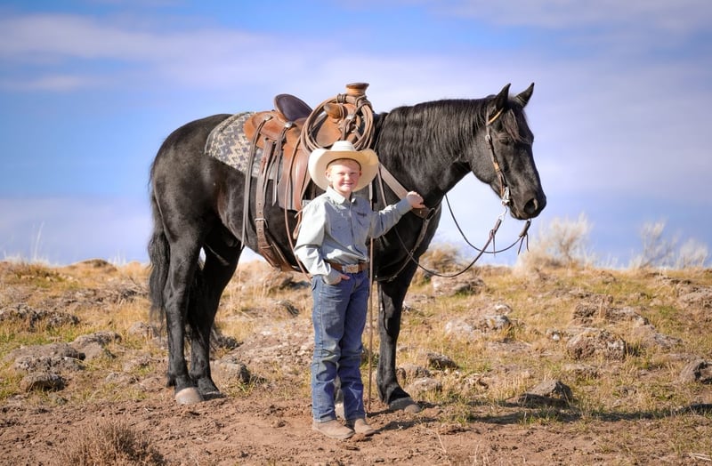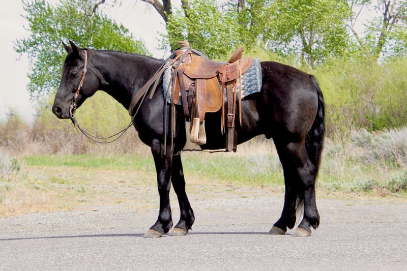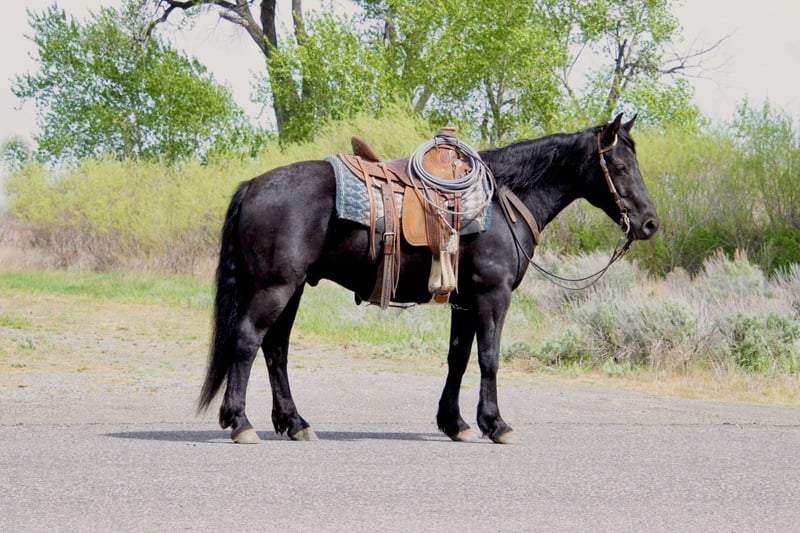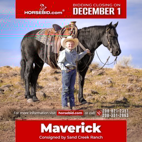 ⚜️ 𝓽𝓱𝓮 𝐇𝐨𝐫𝐬𝐞𝐦𝐚𝐧'𝐬 𝓢𝓱𝓸𝔀𝓬𝓪𝓼𝓮⚜️ Happening now thru MONDAY | DECEMBER 1st - Available EXCLUSIVELY on HorseBid's website! For more details and to register visit: www.Horsebid.com CONSIGNOR CONTACT: Sand Creek Ranch 208-821-2351 or 208-351-2863 LOCATION: Saint Anthony, ID BREED: Draft Cross REGISTERED: No COLOR: Black HEIGHT: 14.3 AGE: 6 GENDER: Gelding Maverick is a pretty Solid black 14.3 hh 6 year old draft cross gelding. He is the perfect size with a solid build and good bone that he can carry anyone who can ride. Maverick is a gem on the trail! He has a nice walk on him and not one you have to peddle. Maverick has gone through rivers, muddy trails, up mountains and even swam in lakes. He has a nice stocky build that’s built to last. Maverick can handle technical trails without missing a beat, carefully picking his foot placement to ensure he and his rider are safe. Maverick handles what the mountain trails have surprised him with ease and confidence taking care of his rider. Maverick is also trained to come to a mounting block for easy mounting and dismounting. He has a smooth rocking-chair lope, nice neck reign, stop and backup. Maverick has been exposed to different obstacles and approaches them with confidence and curiosity. He is sacked out and will go through our obstacle course which includes a teddee todder bridge, pool noodles, tarps, and logs. He has been used to check cattle, get bulls in, been around dogs and loves to be groomed by the kids. Maverick has been rode by lots of different riders from kid, mom, dad, friends and more. He is the same horse after time off whether it’s a couple days weeks or months. Maverick is an easy keeper, comes to grain to be caught, a good for the farrier, hobble trained, and good to load. Maverick sells with a clean PPE. If you’re looking for a solid trail mount, a horse for the family, one to enjoy the trails and have fun on in the arena maverick is your guy.