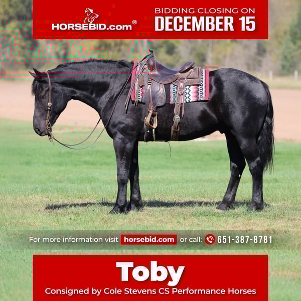 🎄𝐓𝐇𝐄 𝑯𝒐𝒍𝒊𝒅𝒂𝒚 𝐂𝐋𝐀𝐒𝐒𝐈𝐂🎄 Happening now thru MONDAY | DECEMBER 15th - Available EXCLUSIVELY on HorseBid's website! For more details and to register visit: www.Horsebid.com CONSIGNOR CONTACT: Cole Stevens CS Performance Horses 651-387-8781 LOCATION: River Falls, WI BREED: Crossbred REGISTERED: No COLOR: Black HEIGHT: 16.3-17 AGE: 6 GENDER: Gelding TOBY – Outstanding Jet-Black Crossbred Gelding Offered Exclusively on Horsebid.com If you’ve been waiting for that hard-to-find, big, beautiful, broke crossbred gelding—your search is over. Toby is a 6-year-old jet-black crossbred gelding who stands an impressive 16.3–17 hands and checks every box for looks, disposition, and ability. Toby has been used for every job on the ranch. He has gathered and doctored yearlings, been hauled for countless trail rides, and has proven himself to be the same trustworthy partner every time you saddle him. He is truly point-and-shoot—confident, willing! In the arena, Toby is a pleasure to ride. He lopes around like a Quarter Horse, is soft, good-leaded, and rides one-handed. He is broke enough to go bridleless, and he has also been ridden English, making him versatile for riders who enjoy multiple disciplines. Recently started over fences, he took to jumping naturally and confidently. Before joining our program, Toby was used as a rodeo flag horse and to clear cattle from the arena. He has been under bright lights, loud music, and big-crowd energy—nothing fazes him. His gentle disposition is truly genuine, and his big, friendly personality makes him a barn favorite. Toby stands out wherever he goes—his presence, build, and kind eye speak for themselves. He is straight, clean-legged, sound, and has great feet. He is ready for his next home where someone will use him, enjoy him, and appreciate his many talents. Don’t miss the opportunity to own this exceptional gelding.