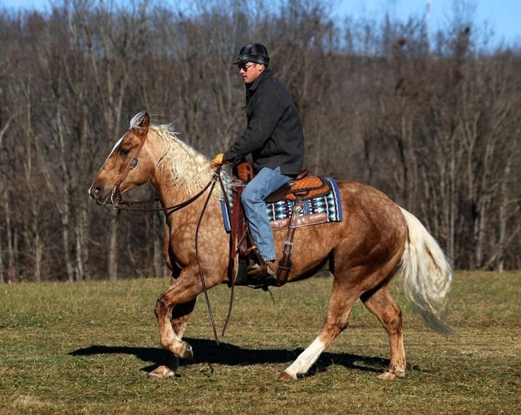 ONLINE AUCTION Place your bids at www.PlatinumEquineAuction.com Starting Bid $3500 Auction ends June 23rd, 2024 Need a new saddle? Check out White Rock Saddles on our website or Facebook! Dream horses do exist and Aspen is living proof of that! Talk about a horse that gets ALL of the looks where ever he goes!!! Aspen is a super stout built Golden Dappled Palomino Draftcross gelding standing around 15.2hh and he is 6 years old! In the fall/winter Aspen has more dapples than your eyes can count, as he is a high contrast dappled palomino. In the summer he is a dark golden palomino with chocolate highlights… he is always BEAUTIFUL!!! Aspen has been with us for almost 2 years now and we used him as my personal horse. He went through the natural horsemanship training and learned some tricks a couple years ago, where he would bow and lay down. Aspen has been used to around cattle and has caught wild ones, (roped/tied down), he has been used in the branding pen and used to doctor as well. He has been ridden down the highways, we have had him in town and he is very traffic safe. Aspen is great on trails and he will cross creeks, ditches, logs and navigate rough rocky areas. He has a smooth jog, a VERY VERY nice easy to set lope, a good stop, spins a circle both ways and backs with ease! He has been exposed to all kinds of wildlife such as deer or turkey or other animals like cows or dogs and will go anywhere that he is asked too. He has been rode many miles in the mountains of Eastern Kentucky and encountered every obstacle possible on the trail. He will go up or down even the steepest slopes, across deep creeks, over downed trees, and over all types of rough terrain while still being sure footed. Aspen is not cinchy, cold backed, does not crib or weave. Located in Level Green, KY. Feel free to call Moore Trained Horses Logan 765-265-0033 with any questions. ONLINE AUCTION Place your bids at www.PlatinumEquineAuction.com Starting Bid $3500 Auction ends June 23rd, 2024 Need a new saddle? Check out White Rock Saddles on our website or Facebook!