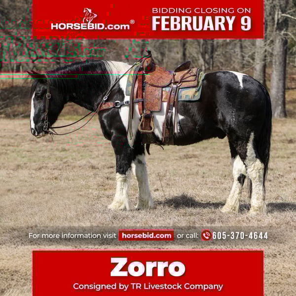 ❤️🔥𝑩𝒆 𝑴𝒊𝒏𝒆 𝐒𝐄𝐋𝐄𝐂𝐓❤️🔥 Happening now thru MONDAY | FEBRUARY 9th - Available EXCLUSIVELY on HorseBid's website! For more details and to register visit: www.Horsebid.com CONSIGNOR CONTACT: TR Livestock Company 605-370-4644 LOCATION: Rusk, TX BREED: Draft cross REGISTERED: No REGISTERED NAME: Zorro COLOR: Paint HEIGHT: 16 AGE: 8 GENDER: Gelding Zorro is a 8 year old paint draft cross (1/2 Percheron — 1/2 QH) gelding standing 16 hands tall. If you’re looking for a talented and steady crossbred, that is smart and always aims to please here he is! Zorro has a nice lope in the arena, he has smooth transitions and has a lot of ability inside and out! Zorro is great on the trails, goes through water, different terrain and over obstacles. He has been used around cattle for being ranch work such as gathering, penning and even sorting! He will ride out alone or in a group and even has been rode in town! He stands tied, loads, bathes. He’s easy going and an easy keeper! If you’re looking for gentle as well as athletic ability in a draft cross that is absolutely easy to get along with here he is! Call or text TR Livestock 605-370-4644 (Rachel) for more info! Located in Rusk TX, nationwide shipping available!