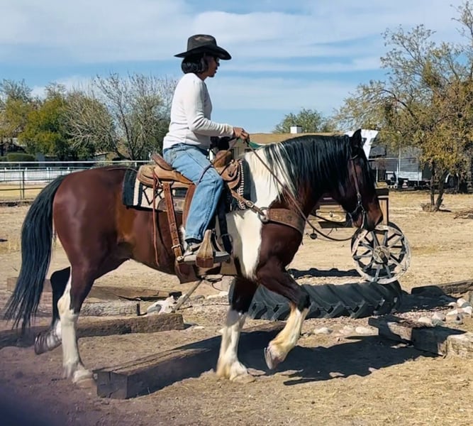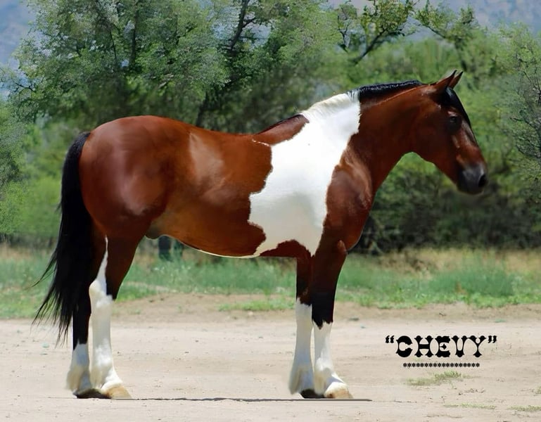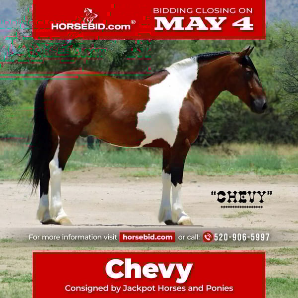 ▪️▫️◾️𝐭𝐡𝐞 𝑴𝒂𝒚 𝐒𝐞𝐥𝐞𝐜𝐭◾️▫️▪️ Happening now thru MONDAY | MAY 4th - Available EXCLUSIVELY on HorseBid's website! For more details and to register visit: www.Horsebid.com CONSIGNOR CONTACT: Jackpot Horses and Ponies 520-906-5997 LOCATION: Marana, AZ BREED: Spotted Draft Cross REGISTERED: No REGISTERED NAME: Chevy COLOR: Bay Tobiano HEIGHT: 15 AGE: 9 GENDER: Gelding Chevy is very unique colored and cool looking draft cross gelding. He turns heads and gets compliments wherever he goes. He is a handy size!! Standing 15 hands, he is big bodied, big boned with some feathering on his legs. Chevy is a ranch horse deluxe. He has been ridden many miles thru the southwestern deserts pushing and sorting cattle. He is good footed, durable and gets around in all kinds of terrain. Chevy will pick his way thru the rocks, climb the steepest hills with no hesitation and cross water when needed. He has been used at the brandings and has no problem putting in a real days work. Chevy also rides in the arena. He has roped the roping sled both heading and heeling and would finish into a super cool rope horse. He navigates thru the cowboy obstacles with no hesitation. Logs, bridges, teeter totters, tires, flags, he does it all including riding up into the back of a truck. Chevy has also been ridden english and has gone over some small rails. If you decide to ride through town no problem, Chevy is not fazed by traffic or noise. He will go wherever you point him. Chevy has been used to hunt on. He is handy broke and smooth to ride. Chevy loads and hauls good. He stands tied to the trailer or to a picket line. He enjoys a cool wash down after a long ride and is always willing to have a cookie or two for a treat. Chevy is current on his routine vaccinations, worming and shoeing. He is always sound and requires zero maintenance of any kind. He has no special feed requirements or restrictions. He will eat whatever is offered to him and he's happy doing it. Chevy has worked a real job, and has a business kind of attitude. If you want a horse that you can go work on or ride in many types of disciplines without worrying about durability Chevy can get the job done. We can help arrange shipping nationwide.