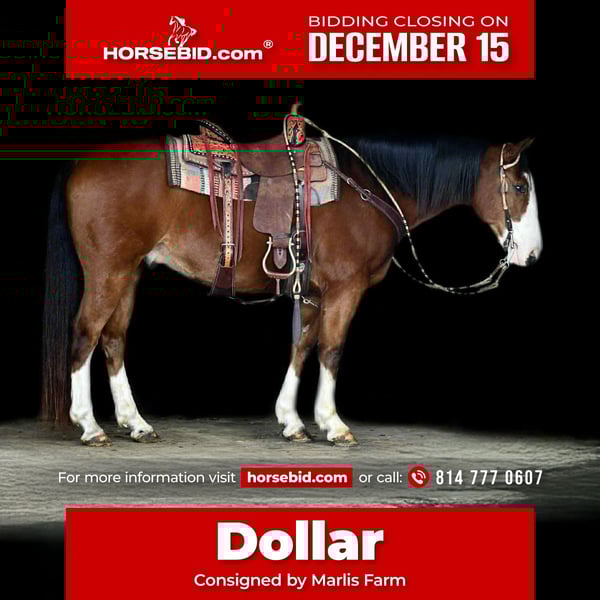🎄𝐓𝐇𝐄 𝑯𝒐𝒍𝒊𝒅𝒂𝒚 𝐂𝐋𝐀𝐒𝐒𝐈𝐂🎄 Happening now thru MONDAY | DECEMBER 15th - Available EXCLUSIVELY on HorseBid's website! For more details and to register visit: www.Horsebid.com CONSIGNOR CONTACT: Marlis Farm 814 777 0607 LOCATION: Rebersburg PA BREED: Crossbred REGISTERED: No REGISTERED NAME: Dollar COLOR: Bay HEIGHT: 15.1 AGE: 8 GENDER: Gelding Dollar as we call him is a 15.1 hand 8yr old bay crossbred gelding that is a been there, done that kind of gelding. He is well broke to ride, he does well in the arena, he picks up both his leads and has a super smooth walk, trot and canter, and is soft and responsive to leg cues. Dollar rides english and jumps a course of fences and is very willing to please. Dollar is also a seasoned trail horse and will go out alone and wherever you point him, he rides great in a group as well. We have also taken him down the main highway into town and he dont mind all the traffic and commotion. Dollar is quiet anough my little boys can lead and brush him with no issues. I think Dollar would be a great fox hunter prospect or a jumping prospect for youth. Dollar rides the same everytime you saddle him. He does well inside or turned oit in a mixed herd. He stands to be tacked, mounted and to be washed and shod. Dollar sells sane , sound and ready to move into his forever home. For more info or to come visit him call Mark 814 777 0607 (call only) We can help arrange shipping anywhere!!