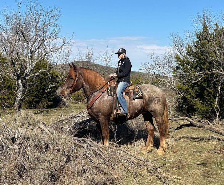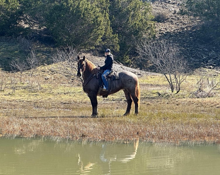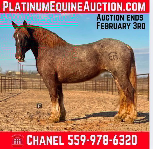 ONLINE AUCTION Place your bids at www.PlatinumEquineAuction.com Starting Bid $3500 Auction ends February 3rd, 2025 Need a new saddle? Check out White Rock Saddles on our website or Facebook! Merlot is a beautiful red roan mare standing 16.2 hands tall with enough mass to pull a house down. We normally call horses like her the perfect beer drinking horse but this mare is so classy we call her a wine drinking horse. Merlot is a sweet mare that is gentle and kind. She lowers her head to be haltered and bridled. She saddles up like a lady every day and is the perfect mount to jump on and go down the trails, or hook up and drive to town. She will cross all the obstacles we have found including water, logs, brush, and mud and will go up and down even the toughest of terrain with sure footedness. She will lead, follow, or go out on her own. She loads and unloads with ease and stands tied. Merlot will stand at the mounting block, cross tie, and is good stalled or turned out. We have never seen her show any mare tendencies. She is barefoot and sound with clean/straight legs. She is a stunning mare with chrome and mass that you have to see in person to appreciate! FMI call/text Holland Horse Co Chanel 559-978-6320. We are happy to answer questions, schedule a test ride, or help arrange shipping nationwide! Located in Jacksboro, TX. ONLINE AUCTION Place your bids at www.PlatinumEquineAuction.com Starting Bid $3500 Auction ends February 3rd, 2025 Need a new saddle? Check out White Rock Saddles on our website or Facebook!