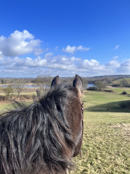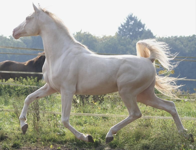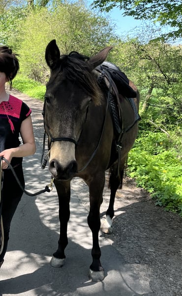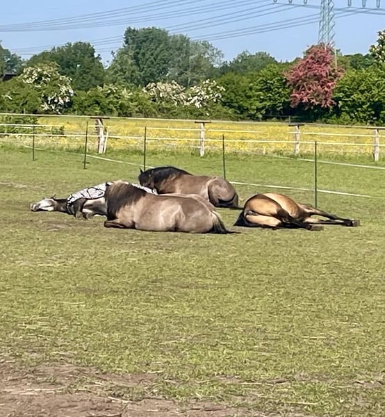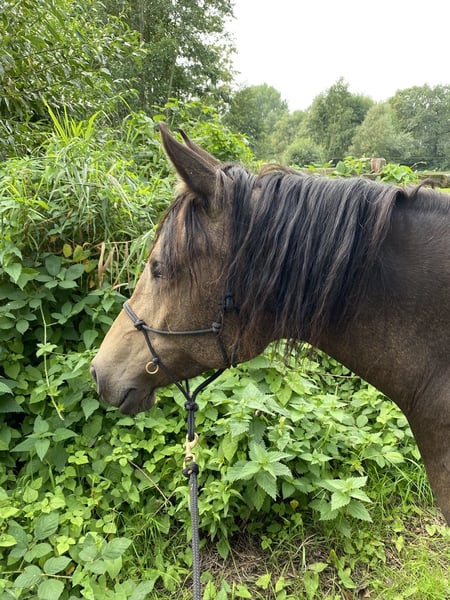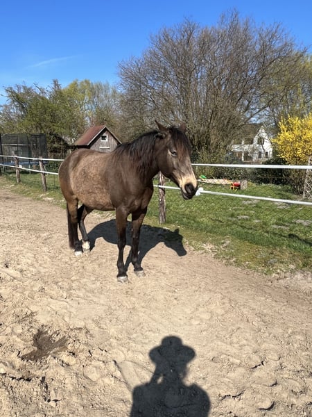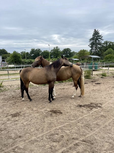 If everything fits, I am offering my 9-year-old part-bred Arabian mare in buckskin color for sale. She is a very refined horse, and I have only ridden her bitless so far. We have done a lot of groundwork and natural horsemanship. Otherwise, we mainly rode in the outdoors for leisure. I have also used her occasionally for therapeutic work. She can be very relaxed, but also as typical for Arabian horses, spirited and energetic. She also has the "turbo gait," meaning she is very fast and enjoys moving. She has always been kept in an open stall with me, and I would like this to continue for her. However, she needs a secure dry shelter, as she tends to be lower in the herd hierarchy and does not like standing in the rain. Alternatively, a paddock-box at night and pasture during the day would also be suitable for her. She is barefoot (I put hoof boots on her for rides in front) and has no problem with her hooves being handled. She has been regularly vaccinated, dewormed, and had her teeth checked annually. She also receives osteopathic treatment once or twice a year. Due to her generally high body tension, I occasionally give her small massages while grooming. Even if she can get quite lively, she is always very manageable on a long lead rope. Most recently, she was in a mare herd, but she is also familiar with mixed herds. She is not a heavy weight carrier; I would say she can comfortably carry up to 70 kg. I am only placing her in the best hands – this is not an emergency sale. She is also likely to pass on many different color genes. The last picture shows her sire, Paintabian "Shicco Ibn Shai." I have a specially fitted Deuber Jerez saddle in size S2 (Bückeburg model) for her, which can be purchased separately.