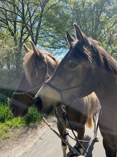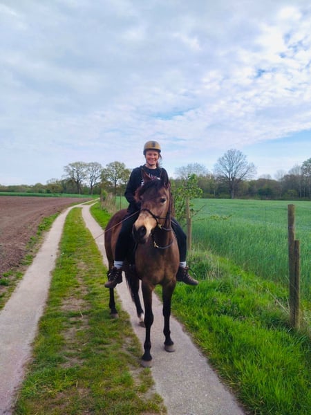 Als alles klopt, bied ik mijn 9-jarige Partbred Arabische merrie in de kleur Buckskin te koop aan. Ze is een zeer fijn paard en ik heb haar tot nu toe alleen bitloos gereden. We hebben veel grondwerk en Natural Horsemanship gedaan. Verder zijn we voornamelijk recreatief in het terrein geweest. Ik heb haar ook af en toe ingezet voor therapeutisch werk. Ze kan diep ontspannen zijn, maar is ook typisch Arabisch temperamentvol. En ze heeft ook de "Turbo-gang", wat betekent dat ze erg snel is en graag beweegt. Bij mij stond ze altijd in een open stal en dat zou ik ook voor haar willen. Ze heeft echter een veilige plek in een droge schuilplaats nodig, omdat ze de neiging heeft om ondergeschikt te zijn en niet graag in de regen staat. Alternatief zou een paddock-box 's nachts en weide overdag ook goed voor haar zijn. Ze loopt zonder ijzers (voor buitenritten trek ik haar hoefschoenen aan) en laat haar hoeven zonder problemen behandelen. Ze is regelmatig gevaccineerd, ontwormd en haar tanden worden jaarlijks gedaan. Eén tot twee keer per jaar krijgt ze een osteopathische behandeling. Aangezien ze de neiging heeft een hoge spierspanning te hebben, geef ik haar af en toe kleine massages tijdens het poetsen. Ook al kan ze behoorlijk opgewonden raken, is ze op elk moment aan de lange lijn super goed te houden. Bij mij stond ze laatst in een merriesgroep. Ze kent echter ook gemengde groepen. Ze is geen gewichtdrager. Ik zou zeggen dat ze tot maximaal 70 kg goed kan dragen. Ik geef haar alleen in de beste handen - het is geen noodverkoop. Ze kan waarschijnlijk ook veel verschillende kleurgenen doorgeven. Op de laatste foto is haar vader, Paintabian "Shicco Ibn Shai". Ik heb een speciaal aangepaste Deuber Jerez in maat S2 (Bückeburger model) voor haar, die apart kan worden aangeschaft.