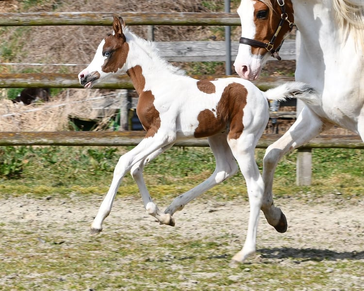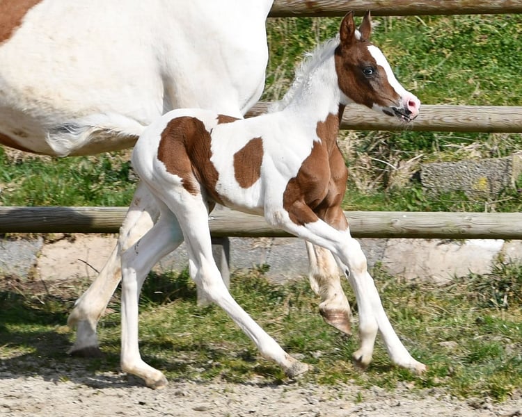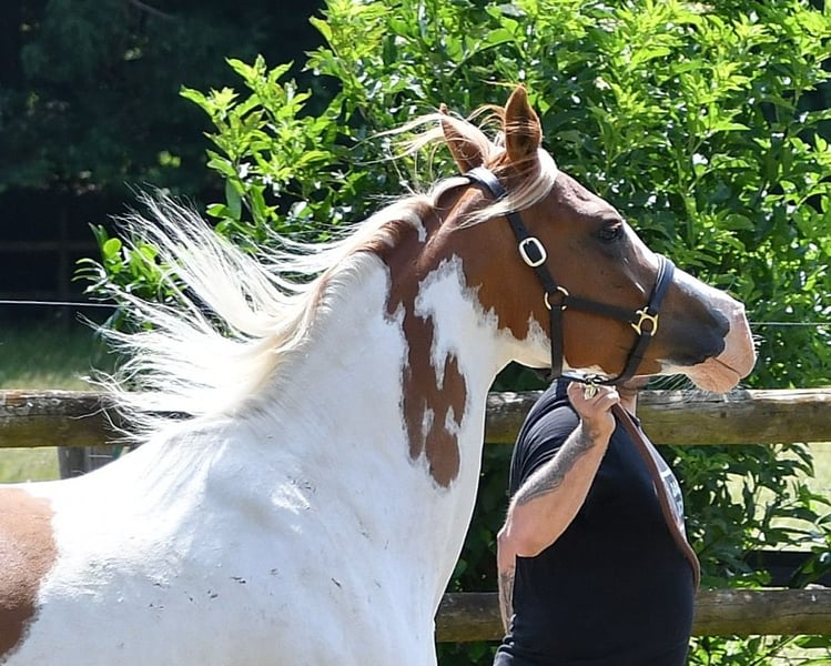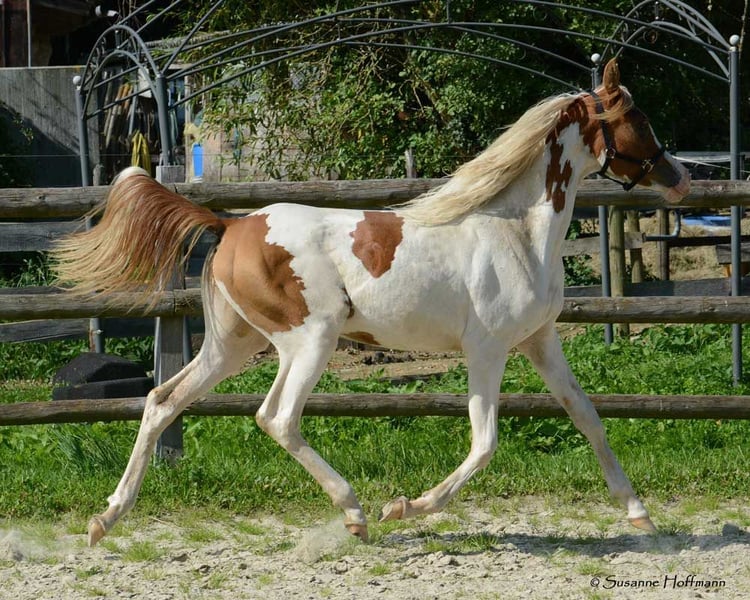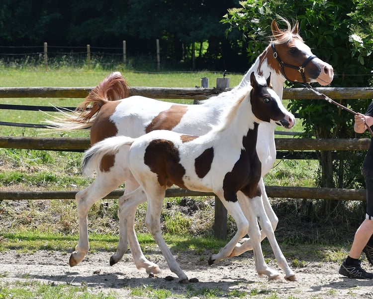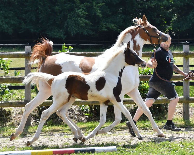 Our Sunah is a true rarity; you don't often find such typy Arabian Partbred foals, and on top of that, she has two blue eyes and is homozygous Tobiano tested. Therefore, I would have loved to keep her, but unfortunately, I have to reduce my numbers for health reasons, so I am now offering her, which is not easy for me. She is not only beautiful and particularly striking, but above all, she has a character made of gold and is an absolute treasure to handle. Super cool and relaxed, she has mastered everything we have shown her so far, whether it’s the farrier or loading onto a trailer; she just goes along with everything. She is exceptionally typy, which is certainly due to her excellent lineage, which reads like the who's who of Arabian Partbred breeding. Her father, Crazy in Love, is a son of the champion stallion and reserve champion of the stallion performance test, Limited Design. His mother is Painted Sensation, a daughter of Khalvin Khlein, both from our breeding. The mother, Solea, is already in the 6th generation from our breeding, and her mother and grandmother are still on-site for viewing. Solea's father, A Wise Guy of Kossack ox, combines modern Shaul lines with the best Russian performance blood in his pedigree. These Russian lines are also strongly represented in Solea's mother. The photos show her at the inspection appointment at just over 3 months old, then a few days old, and finally her father first and then her mother.