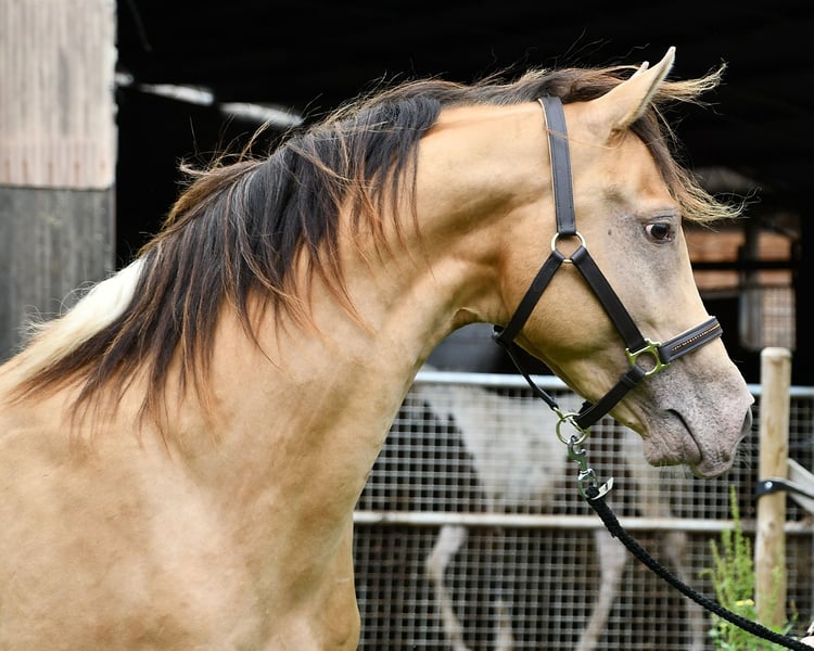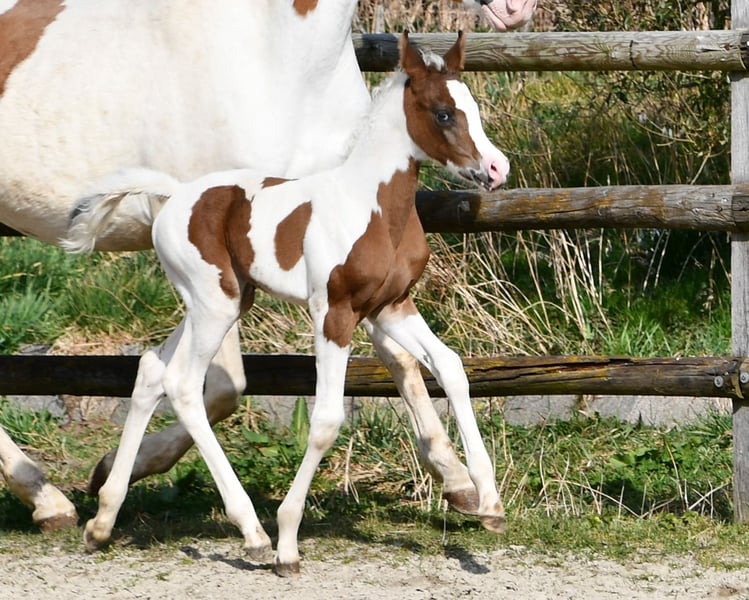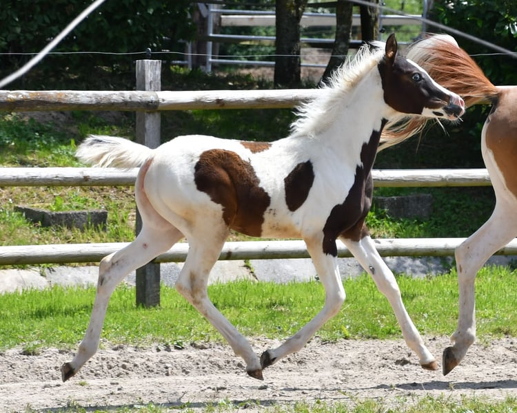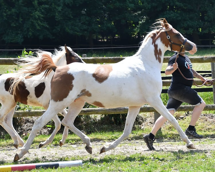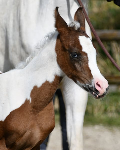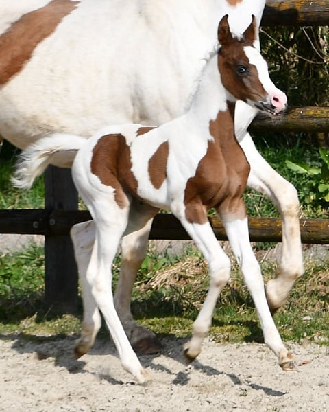 Notre Sunah est une véritable rareté, on ne trouve pas souvent des poulains Arabisch Partbred aussi typiques, et de plus, elle a deux yeux bleus et est testée homozygote Tobiano. C'est pourquoi j'aurais vraiment aimé la garder, mais malheureusement, je dois réduire pour des raisons de santé et je l'offre donc maintenant, bien que cela ne soit pas facile pour moi. En effet, elle n'est pas seulement belle et particulièrement frappante, mais surtout, elle a un caractère en or et est un véritable trésor à manipuler. Super cool et détendue, elle maîtrise tout ce que nous lui avons montré jusqu'à présent, que ce soit chez le maréchal-ferrant ou en van, elle fait tout sans problème. Elle est extrêmement typique, ce qui est certainement dû à son excellente lignée, qui se lit comme le who’s who de l'élevage Arabisch Partbred. Son père, Crazy in Love, est un fils du champion de concours et réserviste de l'épreuve de performance des étalons, Limited Design. Sa mère est Painted Sensation, une fille de Khalvin Khlein, tous deux issus de notre élevage. La mère, Solea, est déjà de la 6ème génération de notre élevage et sa mère et sa grand-mère sont encore sur place à visiter. Le père de Solea, A Wise Guy of Kossack ox, combine dans son pedigree des lignées modernes de Schaulin avec du meilleur sang de performance russe. Ces lignées russes sont également fortement représentées chez la mère de Solea. Les photos la montrent lors de la visite de sélection à environ 3 mois, puis quelques jours après sa naissance, et enfin son père, puis sa mère.