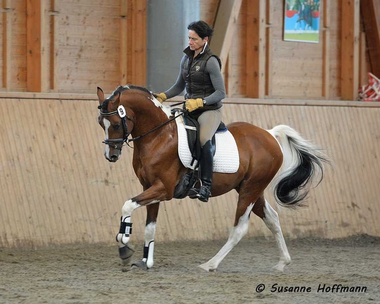 Notre Vendetta est une pouliche très marquée par le sang arabe, avec un joli visage mais aussi une bonne conformation et d'excellents points pour devenir une jument de selle. Elle est déjà habituée au licol et a quotidiennement des interactions avec les humains, apprenant jusqu'au sevrage tout le reste de l'alphabet des poulains, y compris le maréchal-ferrant et le chargement. Vendetta est testée homozygote pour le Tobiano et pour le noir, ce qui la rend encore plus intéressante pour l'élevage, car elle produira toujours des poulains colorés et jamais de couleur alezane. Sur les photos, elle n'a que 2 jours. Sa mère, Classic Valencia, est une jument arabe partbred avec plus de 99 % de sang arabe, un caractère exceptionnel et de superbes mouvements. Le père de la petite est notre Painted Dragon, un étalon élite avec une excellente descendance, qui non seulement est un véritable trésor et très montable, mais transmet également cette qualité de manière fiable à ses poulains. Il est visible sur les deux dernières photos.