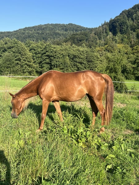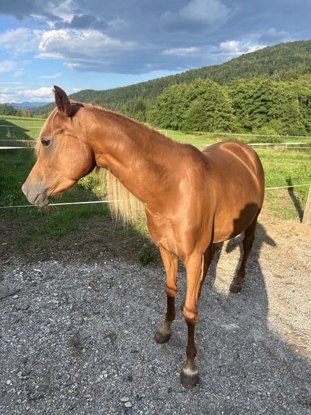 A young warmblood cross mare with Arabian type is offered for sale; she will turn 4 years old this year. The mare has a very attractive appearance, stands approximately 155 cm tall, and has a gentle yet lively temperament. She is healthy, has well-maintained teeth, and is regularly trimmed. The mare is not yet under saddle but is familiar with basic lunging and cooperates nicely. She is accustomed to handling, grooming, and basic daily care. She was raised among other horses and therefore integrates well into a herd environment. Due to her build, she is best suited for a female or lighter rider. I am looking exclusively for a good, caring, and loving home where she will receive plenty of attention, exercise, and proper care.