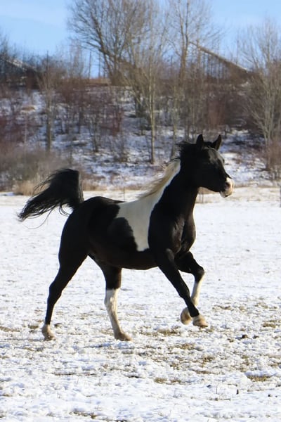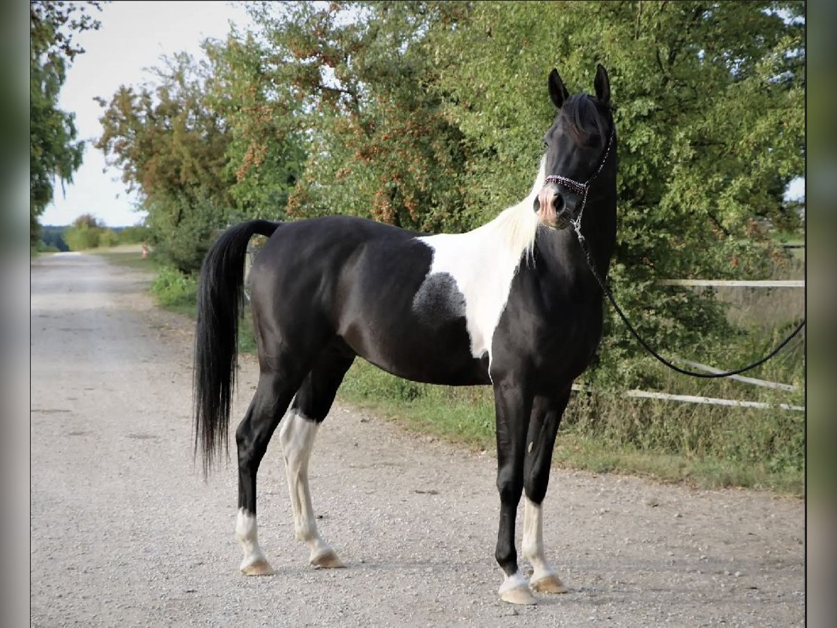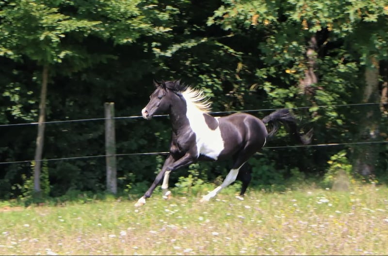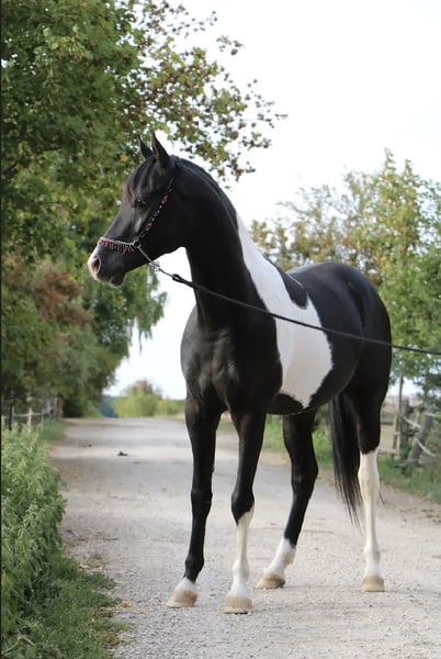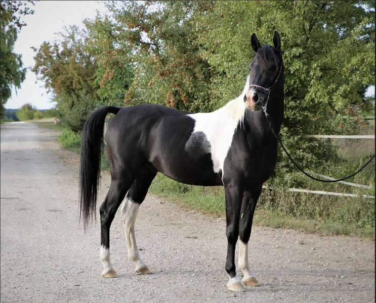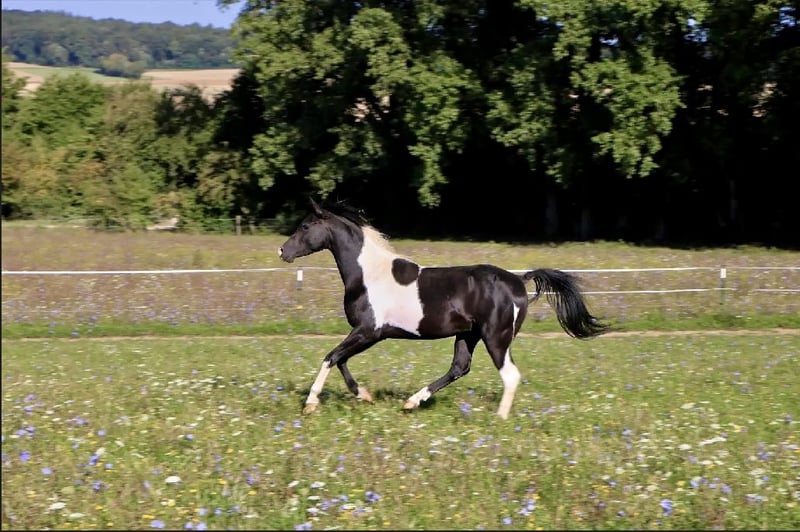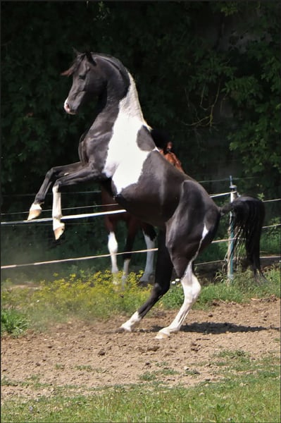 Mounir ist ein sehr liebevoller, dem Menschen zugewandter Pintabian Hengst. Er ist fleißig und lernwillig, will stets gefallen und ist bemüht immer alles richtig zu machen. Die „Arbeit“ mit ihm macht richtig Spaß da er immer sehr motiviert ist, er hat einfach Freude an der Zeit die er mit seinem Menschen verbringt. Er sucht regelrecht die Aufmerksamkeit und versucht sich in seiner Gruppe in den Vordergrund zu stellen wenn jemand den Stall oder die Koppel betritt. Mounir ist 2025 beim ZSAA gekört und prämiert. Er ist ein sehr typvoller maskuliner Hengst mit kräftiger Substanz. Er besitzt eine gute Halsung und eine große genügend schräge Schulter, eine geschwungene Oberlinie mit guter Anbindung in eine gut behoste runde Kruppe. Passendes trockenes Fundament mit guter Röhre (20 cm). - Schmiedefromm - Verladefromm - kennt Bodenarbeit - kennt Sattel - kennt Longe Spaziergänge alleine oder in der Gruppe sind kein Problem. Ob am Putzplatz, in der Reithalle oder auf dem Reitplatz zwischen Wallachen und Stute ist er immer anständig und ansprechbar. SCID und CA frei