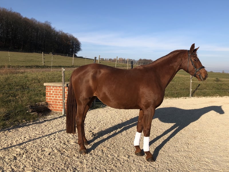 Direkt aus Züchterhand wird diese 1,74 m große, mit bestem Pedigree ausgestattete, sehr im Typ stehende Fuchsstute zum Verkauf angeboten. Diese sehr großrahmige Stute ist auf unserem Landgut geboren und wuchs anschließend in einer Fohlenherde artgerecht auf. 2013 wurde sie in das Rheinische Pferdestammbuch aufgenommen und erhält bei der Eintragung das Prädikat "Verbandsprämienstute". Agatha Christie wurde ausschließlich zur Zucht eingesetzt und brachte uns stets sehr gute Nachkommen. Sie ist nicht in Beritt gewesen und wird als Zuchtstute angeboten, um diese wertvolle Zuchtlinie (MV Argentinus) zu erhalten. Sie ist kerngesund und steht zur Zeit in einer Stutenherde. Bei Interesse können Sie uns gerne eine E-Mail schreiben oder Sie melden sich telefonisch unter +49 (0)1707739069.