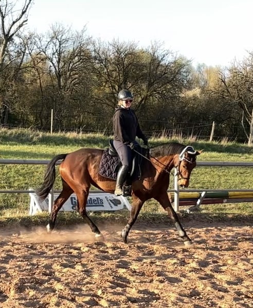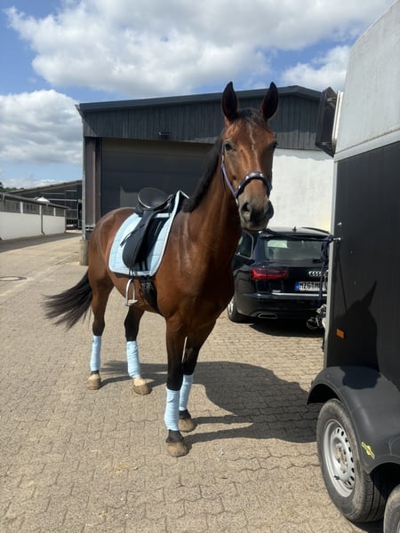 Seven-year-old mare for sale as a broodmare due to personal circumstances. Lucy has been in my possession since she was three years old and is familiar with riding in an arena, indoor or outdoor, though she can be a bit challenging at times, which is why she is also being sold as a broodmare. She loads well and is calm when at the blacksmith. Lucy is registered as a competition horse and is regularly vaccinated and dewormed. She has experience traveling longer distances in a trailer, having been on holiday to the Netherlands twice. She is very affectionate, enjoys cuddling, and loves being worked from the ground (e.g., equikinetics, lunging, walking out, etc.). She is also ideal as a hand horse for riding out in the field (walk, trot, canter). Lucy is familiar with pole work, free jumping, and has previously jumped with a rider. She is a very sensitive mare who can become stressed easily, which has occasionally affected her stomach in the past, leading to mild gastric ulcers (September 2023). Since then, she has had no further issues. Please feel free to contact me with any questions. Videos can be provided upon request.