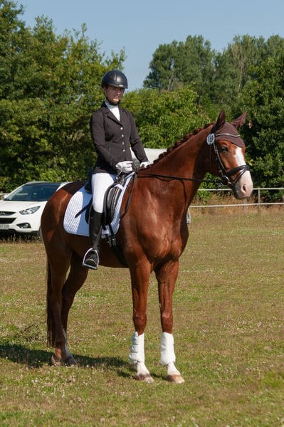 Farley, urodzony 16.05.2015, to niezwykle uroczy wałach, który od 2019 roku jest w stałych, troskliwych rękach – przejęty bezpośrednio od hodowcy i od tego czasu rozwijany z cierpliwością i spokojem. Był delikatnie szkolony, zajmuje miejsca na podium w zawodach i obecnie pracuje na poziomie L w ujeżdżeniu. Farley zachwyca trzema bardzo przyjemnymi podstawowymi chodami – szczególnie jego wygodny galop i rytmiczny krok sprawiają, że jazda to prawdziwa przyjemność. W trakcie wzmocnienia w stępie ma się wrażenie, że unosi się nad placem. W obcowaniu zawsze jest przyjazny i absolutnie niezawodny. Farley to prawdziwy przytulak – zarówno dla ludzi, jak i dla koni, zawsze szuka bliskości i cieszy się z każdej uwagi. Podczas czyszczenia, siodłania czy po prostu w stajni: zawsze jest zrównoważony i przyjazny. Również w terenie prezentuje się pewnie – najbardziej lubi małe grupy, w których bacznie i spokojnie podąża. Ma również radość z pracy z przeszkodami i z przyjemnością pokazuje się na lonży oraz podczas wolnego skakania. Farley jest łatwy w obsłudze, dobrze współpracuje z kowalem i jest spokojny podczas wizyt weterynarza – to bezproblemowy partner z urokiem i sercem, który przyniesie swojemu człowiekowi wiele radości. Idealny koń dla jeźdźców, którzy cenią sobie serdeczne współżycie, klarowną komunikację i delikatną jazdę.