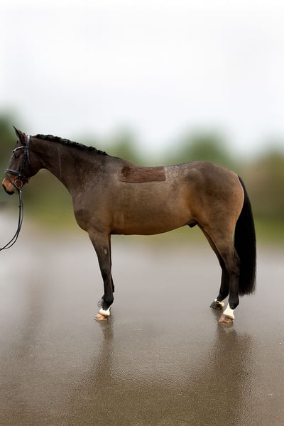 Este caballo de 5 años, un potro, llega directamente del criador y lleva solo 3 meses bajo la silla, por lo que está completamente sin usar. Se desenvuelve con seguridad en las tres gaitas y ha superado sus primeros saltos bajo la silla. En general, es muy tranquilo, aunque todavía tiene poca experiencia. Con una formación adicional, seguramente será un caballo con el que se puede disfrutar mucho. Disponemos de buenas radiografías.