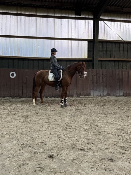 My little Fred is looking for a new home. I bred him myself from a Carry Gold mare. His sire is Feinrich. He is a very handsome chestnut gelding, now six years old, and already confidently jumping flying changes. He learns very quickly and always strives to do everything right. He has an excellent work ethic and a very charming personality. He is very people-oriented and loves attention. Apart from dressage work, he is also familiar with double longeing, and we have taken him out to jump free several times. He shows great talent in this area. Since he carries jumping bloodlines on his dam’s side, I believe he could also be successful in show jumping. He is regularly dewormed and vaccinated, and is farrier- and loading-friendly. He grew up in a herd and is accustomed to box stalls as well as daily turnout on paddock or pasture. Videos can be sent upon request via WhatsApp.