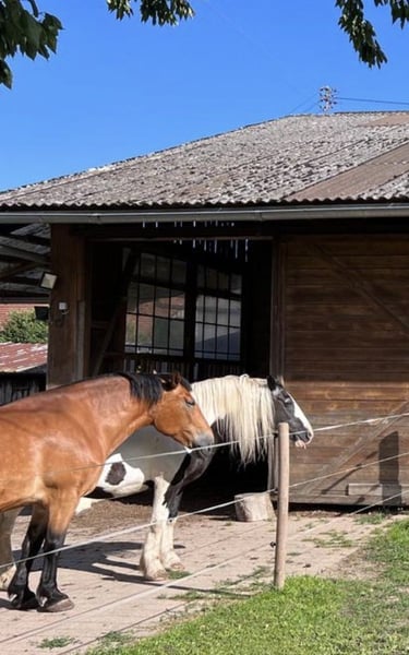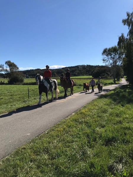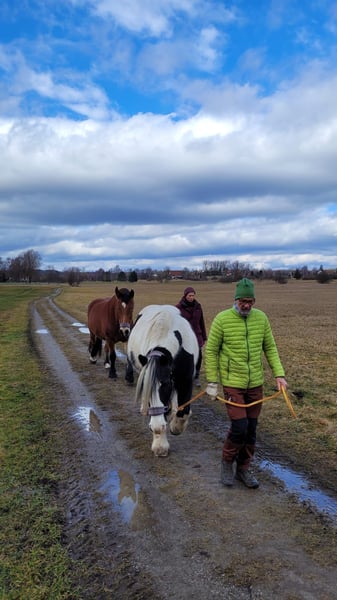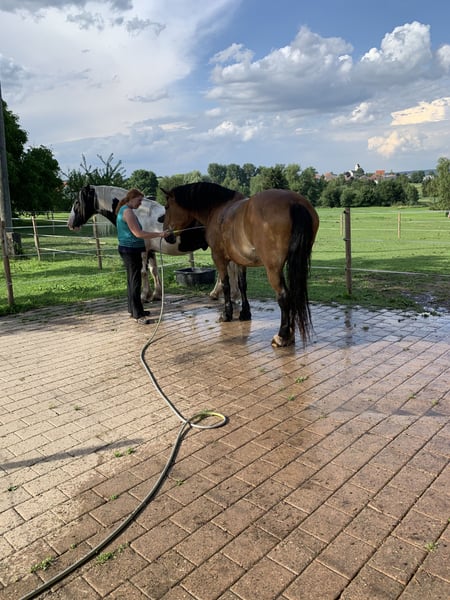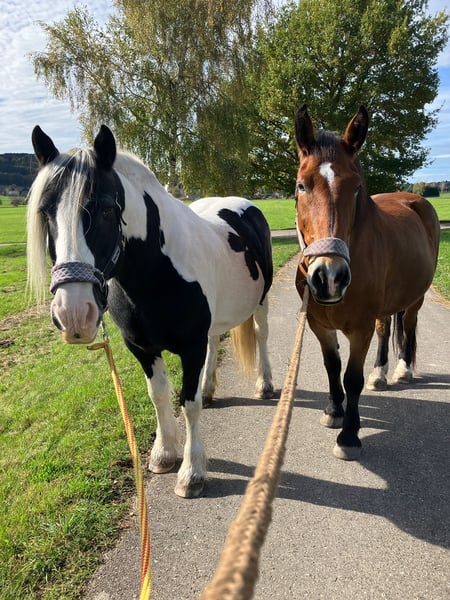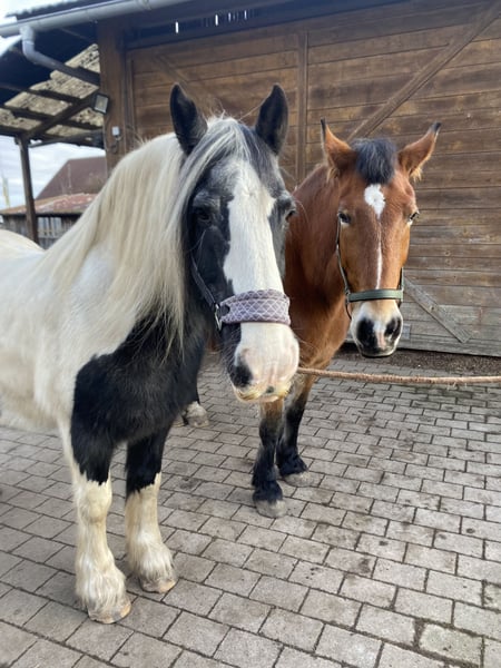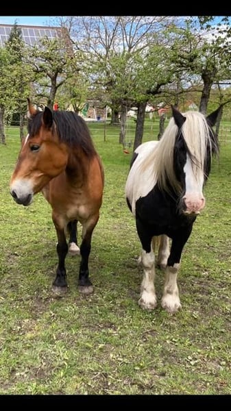 Wir verkaufen unsere zwei Freizeitpferde. Oskar Wallach Schecke schwarz/weis 161 cm Stockmass 17 Jahre alt. Luna Stute Braun mit schwarzer Mähne/Schweif 163 cm Stockmass 16 Jahre alt. Abgabe nur beide zusammen, Preis pro Pferd mit Zubehör (passende Freeform Sättel, Zaumzeuge, Reitpads, Decken und vieles mehr) Wir hatten die beiden Pferde 9 Jahre. Sie waren gesund und immer barhuf. Sie stehen bei uns immer im Offenstall 24 Stunden Heu und Koppeln. Unsere Jugendliche Kinder haben auf Ihnen reiten gelernt und wir waren immer zu Zweit im Gelände unterwegs mit Ihnen. Beide sind früher Kutsche gefahren daher auch strassentauglich. Momentan stehen Sie seit 1-2 Jahren nur noch bei uns am Hof, da die Kinder zum studieren ausgezogen sind und das reiten aufgegeben haben. Daher müssten die Pferde wieder üben, um das abzurufen was sie alles konnten. Sie sind sehr bezogen auf den Menschen und kennen Hunde, Hühner, Ponys, Esel das war nie ein Problem auch die Enkelkinder sind schon drauf gewesen. Sie beißen nicht und schlagen nicht aus. Hufpflege immer alle 8 Wochen und geimpft sind Sie auch. Videos vom longieren auf Anfrage