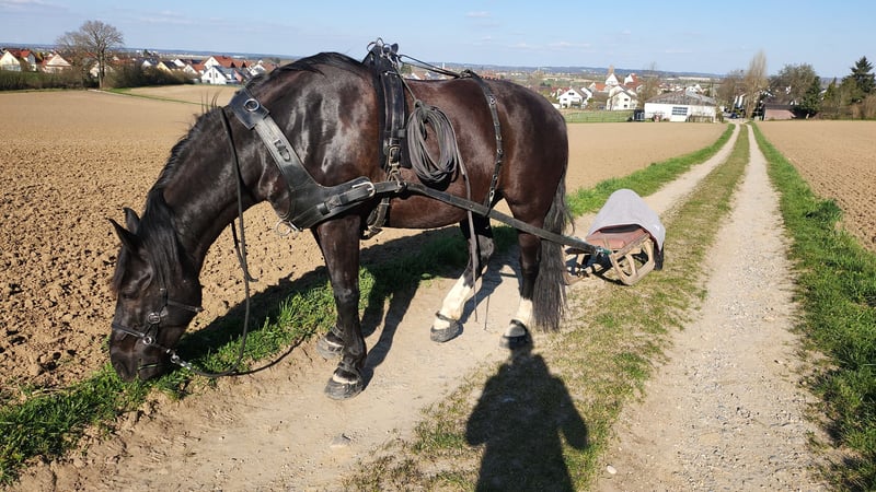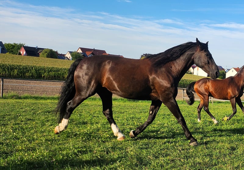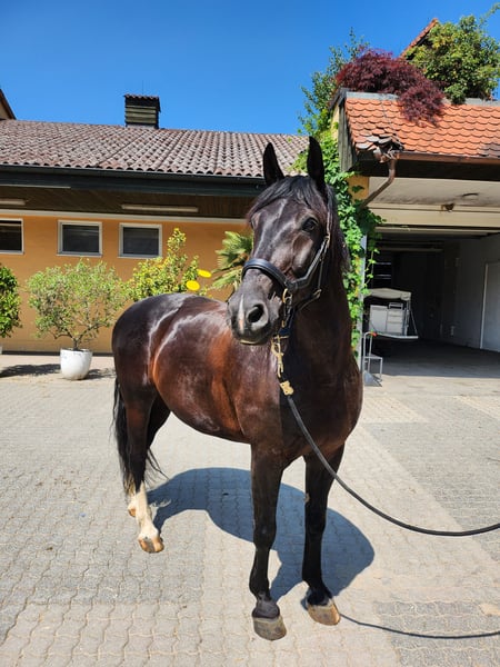 Miro Schlesisches WB – 165cm Stkm – Geboren Juni 2012 Miro ist ein sensibles, lernwilliges, verschmustes und liebes Charakterpferd. Wir sind knapp 6 Jahre zusammen einen spannenden und lehrreichen Weg gegangen aber nun ist es Zeit sich zu trennen. Miro kam mit ca 8 Jahren als grob angerittenes und dann nur gefahrenes Kutschpferd zu uns. Das, was uns damals schon die Hoffnung gegeben hat das er auch ein tolles Reitpferd werden kann, ist seine menschenbezogene und aufgeschlossene Art. Mittlerweile kennt er Reiten in der Halle in allen drei Grundgangarten, Seitwärts, Travers, Schulterherein. (Reiten nach Grundsätzen der Legerete, Klassischen Reitkunst – „hoher“ Kopf) Ausreiten allein und in der Gruppe Schlitten und Egge ziehen Anhängerfahren Trailparcours Wanderritt Als Handpferd neben dem Fahrrad laufen (S+T) Podest und Wippe ( kann mit verkauft werden) Sprünge bis 50cm Spazieren am Halsring Er wurde von mir ausnahmslos gebisslos geritten / bewegt / gefahren. Er reagiert fein mit wenig Einwirkung. Am liebsten aber „arbeitet“ er frei mit dem Menschen und darf seine eigenen Ideen einbringen. Er reagiert sehr gut auf Stimme und wurde von mir mit viel Körpersprache ausgebildet. Er kennt es für alles positives oder „negatives“ Stimmfeedback zu erhalten. Meiner Einschätzung und Erfahrung nach ist er KEIN Kinderpferd. Als Barhufbearbeiterin habe ich seine Hufe immer in einem funktionalen Zustand gehalten. Mittlerweile „trimmt“ sich die Kapsel von selbst sehr gut. Leichte Schiefenkorrekturen hinten müssen weiter vorgenommen werden. Gerne gebe ich dazu eine „Anleitung“ mit auf den Weg. Keine Rehe, Abszesse, Fäule o.ä. Bei längeren Ausritten oder sehr steinigen Wegen haben wir Ihm Hufschuhe angezogen. (werden mitgegeben) Er wurde mehrmals im Jahr Osteopathisch behandelt / unterstützt. Seine Schwächen sind: Das rechte hintere Bein wurde durch das lange einseitige Einspannen (immer rechts außen nach innen gebogen) beim Kutschefahren nicht vernünftig “ausgebildet". Er läuft daher „auf der Hinterachse“ nicht 100% klar z.b. bei nasskaltem Wetter o.ä. Manchmal „Vergisst“ er das Bein auch einfach ;) Ist aber keine Einschränkung für Reiten, Fahren etc, man muss nur etwas Rücksicht darauf nehmen bzw sieht an dem Bein wie sein allgemeiner (energetischer) Zustand gerade ist. Durch die diagonale Schiefe ist sein Huf VL etwas verkleinert / schmäler Da er ein sensibler Typ ist kann er mit Stress nicht sehr gut umgehen und wird dann unruhig (hauptsächlich guckig oder leichte Magenempfindlichkeit). Zahnfleischfisteln - bisher nur am Eckzahn unten links ( ½ Jährlicher Zahnarzt nötig) Er neigt NICHT zum Koliken (hatte in den 5 Jahren bei uns keine einzige) – insgesamt robuste Konstitution, wurde nur bei Dauerregen unter 10°C eingedeckt. Er ist kein Durchgänger oder „Renner“. Er bleibt bei unklaren Situationen immer stehen und kuckt erstmal wie angewurzelt. In sehr ungünstigen Situationen wie, kompletter Überforderung / unpassender drückender Sattel im hinteren Bereich / zu schwerem Reiter kann er mit Buckeln reagieren. War anfangs ein Problem aber seit einigen Jahren stabil gut. >>> Passender 18“ Dressursattel sollte mit übernommen werden. Miro ist absolut sozialkompetent und ordnete sich bisher immer im „Mittelfeld“ ein. Er ist tolerant gegenüber sozial schwächeren, zickigen Stuten und allen anderen die freundlich zu ihm sind. Wenn Ihm jemand unsympathisch ist versucht er sich demjenigen zu entziehen. Hat noch nie gebissen oder böse getreten. Er möchte immer „Everybody´s Darling“ sein, Mensch wie Tier gegenüber. Springt 100%ig NICHT auf ! Er stand bisher immer tagsüber in gemischter Herdenhaltung + Nachts in der Box . Ich könnte mir aber auch vorstellen das er in einem Offenstall klarkommen würde mit einer kleinen Herde. In reine Boxenhaltung / Einzelhaltung mit stundenweiser Koppel verkaufe ich Ihn nicht ! Ich suche jemanden für Ihn, der Ihn weiter in der Freiarbeit sein Können zeigen lässt, Geduld mit Ihm hat wenn er mal wieder unsicher ist, Ihn nicht in eine Form pressen möchte sondern liebevoll fördert und auch mal ein Nein akzeptiert. Er wird alles geben was er kann. Da Ihn mein „Action/PowerProgramm“ auf Dauer gestresst hat suche ich einen NICHT Abenteuerlustigen neuen Menschen für Ihn. Routinen und „Gewohntes“ sind ihm sehr wichtig! Trotz seines kräftigeren Körperbaus sollte der Reiter nicht mehr als 75-80kg wiegen. Seine Vor- und Krankengeschichte seit seiner Geburt ist transparent und bekannt. Platz vor Preis für diesen tollen Allrounder :) Idealerweise möchten meine Mutter und ich sein neues Zuhause besichtigen und weiter freundschaftlichen Kontakt pflegen und bei auftauchenden Fragen unterstützen – wenn gewünscht. Platzvergabe innerhalb von Bayern bevorzugt. Absolut kein Notverkauf! Anrufe unter der Woche bitte erst ab 17:00 01515 9207098 Jasmin Findorff