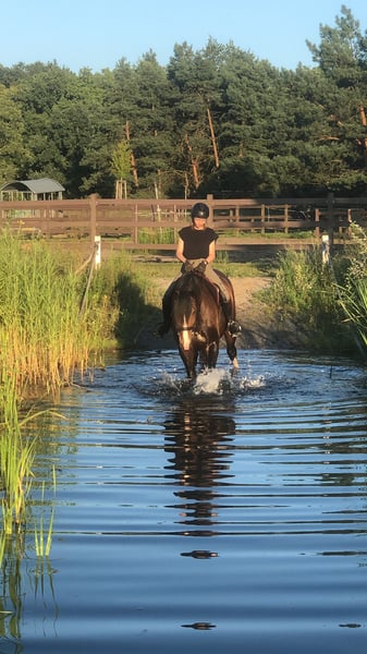 Zum Verkauf steht ein Dunkel Brauner 9-jähriger Wallach Draco der durch seine ansprechende Optik überzeugt. Er wurde überwiegend dressurmäßig gearbeitet und befindet sich auf einem soliden Ausbildungsstand der Klasse A. Zu seinen sichere Lektionen zählen unter anderem Schulterherein, Schenkelweichen, Rückwärtsrichten sowie die Kehrtvolte. Mit weiteren Lektion wie Außengalopp und Traversale wurde begonnen. Teilweise zeigt er sich fein zu reiten und vermittelt dabei ein schönes Reitgefühl. Er hat ein Stockmaß von ca. 170 cm. Er ist problemlos beim Tierarzt sowie beim Hufschmied. Aktuell läuft er barhuf und wurde bereits sowohl alleine als auch in der Gruppe im Gelände geritten. Wir wünschen uns für ihn einen erfahrenen, ruhigen Reiter/ Reiterin mit klarer Linie, der/ die ihn als Pferd schätz und dennoch selbstbewusst und bestimmt mit ihm umgeht. Für Anfänger oder Jugendliche ist er nicht geeignet. Aufgrund seines dominanten Charakters benötigt er eine abwechslungsreiche Arbeit sowie eine ausreichende Auslastung. Vom Boden kann er anspruchsvoll und sehr dominant sein, er wird jedoch nie Kopflos. Aktuell wird er nachts in Boxenhaltung und tagsüber ca. 8.00-15.00 Uhr im Paddock gehalten. Wir können uns allerdings vorstellen das ein Offenstall oder ein Stall mit viel Weidefläche nach einer behutsamen Eingewöhnung geeignet für ihn ist. Ein Weidepartner oder Herdenhaltung würde ihm sicherlich gut tun muss jedoch überlegt und behutsam angegangen werden da er aktuell alleine steht. Ein tierärztlicher Befund liegt vor. Bilder sowie weitere Unterlagen können selbstverständlich eingesehen werden; aktuell scheint ihn dieser in der täglichen Arbeit nicht einzuschränken. Der Hauptgrund des Verkaufs ist auf das fehlende Vertrauen von der Besitzerin an ihn zu rückzuführen welches auch nach intensiven Training nicht Konstanz aufgebaut werden konnte. Auf Wunsch kann er mit einem neuwertigen (ca. 1 Jahr alten), perfekt passenden Ikonik Monoblatt-Dressursattel verkauft werden. Bei ernsthaftem Interesse freuen wir uns über eine Kontaktaufnahme und erzählen gerne mehr.