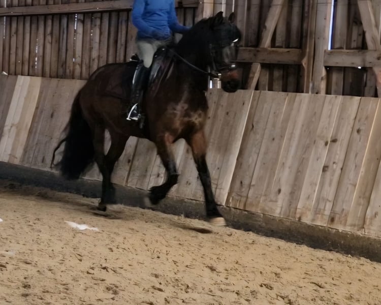 Eine 9-jährige Friesen-Trakehner Stute sucht Möhrchengeber. Klassisch ausgebildet ist Sie, durch Ihren Mut und Ihre Bewegungen, besonders für die Dressur oder Working Equitation geeignet. Sie ist äußerst sitzbequem und stets motiviert und lernfreudig. Zirkuslektionen lernt Sie besonders schnell. Sie kann bereits Aportieren, Lachen, Kompliment und lässt sich Abrufen. Sie sucht ein Zuhause indem Sie sowohl körperliche als auch mentale Auslastung bekommt und einen Besitzer der wie Sie für jeden Quatsch zu haben ist. Eben einen Partner in Crime. Entspannte Ausritte ins Gelände machen ihr ebenfalls Spaß, deshalb kann ich Sie mir auch für ambitionierte Freizeitreiter gut vorstellen. Sie ist neugierig, klar im Kopf und mutig. In den Hänger steigt sie selbstverständlich und auch Beschlagen kann man Sie, durch Ihre gute Hornstruktur ist das aber nicht notwendig. Kurserfahrung hat Sie auch bereit gesammelt und kennt auch "fremdes" Gelände. Zu Ihrem Menschen baut Sie eine enge Bindung auf und ist sehr gut mit anderen Pferden verträglich. Chocolat ist ein sensibles Pferd, welches mit feiner Hilfengebung und mit einer liebevollen, konsequenten Hand geführt werden möchte. Ein tolles Pferd für Menschen, die ein sensibles, arbeitsfreudiges Pferd suchen. Deshalb ist Sie auch kein Anfängerpferd. Es gilt Platz vor Preis. Gepflegtes Equipment kann gerne mit erworben werden.