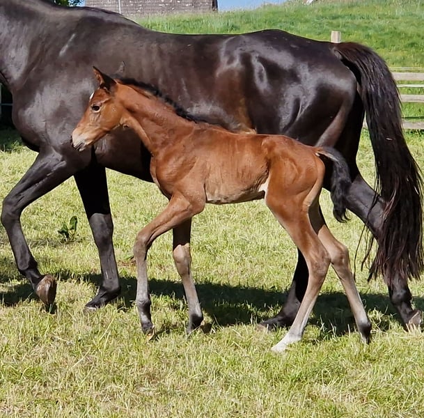 Herzliebe was born at our stud farm Majenfelderhof in May 2025 and has enchanted us since birth. Her father, the premium stallion Noupier x, is descended from the proven eventing sire Duke of Hearts xx from Söderhof. Noupier's maternal grandfather is none other than the world and Olympic participant Troupier x, who competes for Denmark under Nils Hagensen. But Herzliebe's mother, Herzsonne (winner of the Freispringcup SH), also has a successful eventing career, with her father Axis TSF having competed exclusively in dressage up to class S under Terhi Stegars for Finland. An international pedigree in this typified filly leaves all options open. Herzliebe, who is strong in movement and people-oriented, can be raised and trained in experienced hands under generous breeding conditions in our herd.