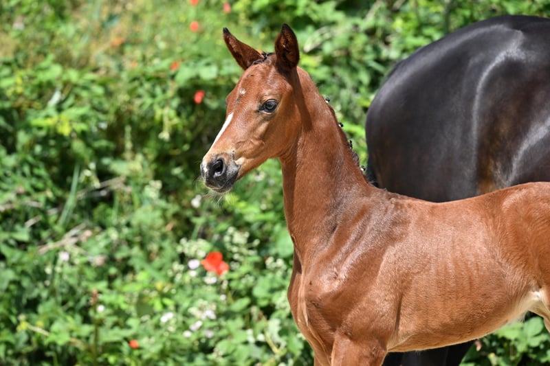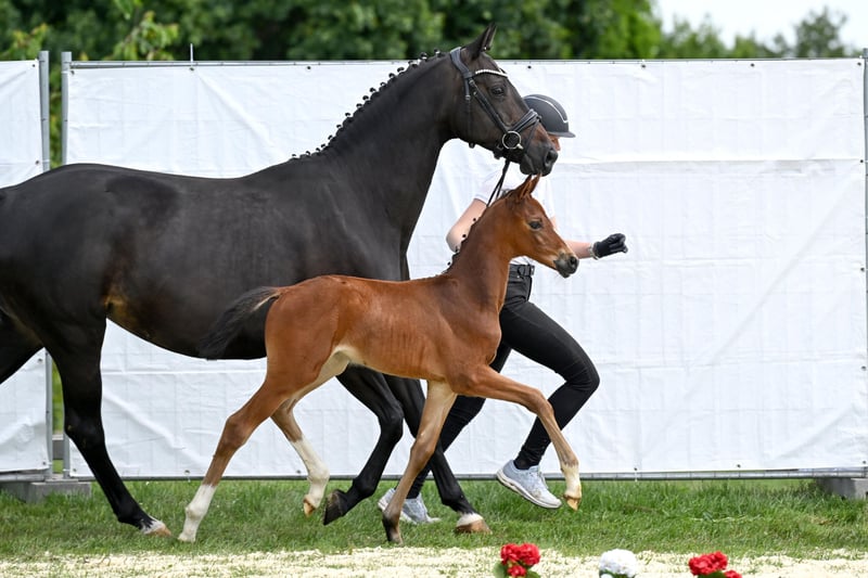 Here presents a type-strong and nobly built daughter of the internationally successful Trakehner stallion Glücksruf I in CIC4*. She impresses with consistently rhythmic movements, good swing development, and can be described as a light-footed dancer of a special kind. Genetically, she also leaves little to be desired: Her mother Gardelegen by Insterburg is, among other things, a half-sister of the premium stallion and Bundeschampionat qualifier Goldfieber (by Le Rouge), the licensed stallion Goldmaß (by Schäplitzer), as well as the winning mare Gardena (by High Motion). Furthermore, she is closely related to the licensed stallion Greenwich Park (by Saint Cyr), who has been successful up to Grand Prix. The foal is growing up appropriately in the herd at the Gestüt Schäplitz and can be viewed at any time. A video is available upon request.