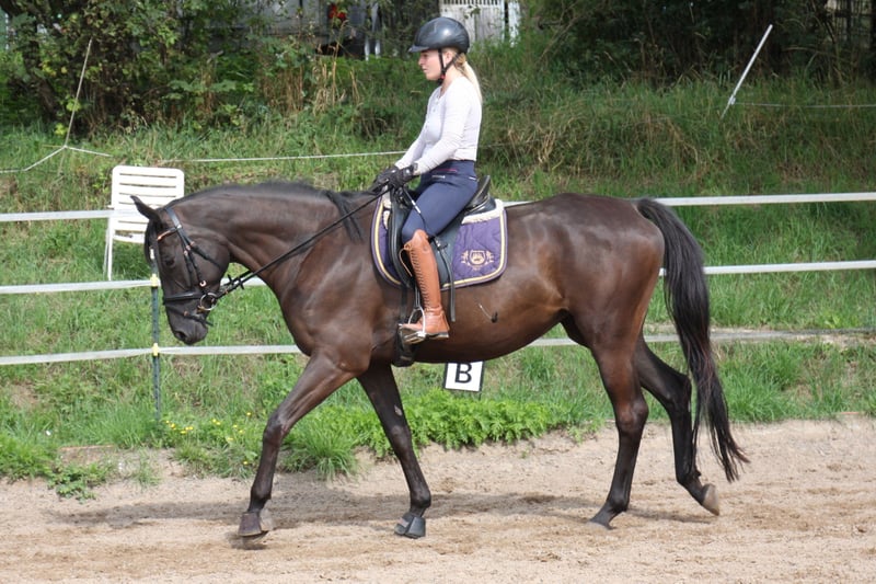 For sale is a beautiful Trakehner black mare with excellent conformation and a lot of potential. She is backed and is already showing great willingness and cooperation under saddle. This mare is an excellent choice for both experienced riders and those in training. Features: Breed: Trakehner Color: Black Age: 4 Height: currently about 165 cm Training level: backed (training started May 2025), extremely well-mannered Character: Very calm, people-oriented, and friendly Shoeing and loading tolerant – no issues with the farrier or in the trailer Health: regular veterinary care, X-rays from April 2025 with no findings – unfortunately, Fiona windsucks. While this is not a health restriction, I want to highlight it here as it is a bad habit and also the reason for the low price. Suitability: Ideal for leisure or sport, both for young riders due to her top character and for experienced riders as she offers enough movement potential for sports as well. Fiona is always calm, good-natured, and cooperative, whether in the stable or in the pasture with other horses, as well as in handling with people both on and off the saddle. Price: €12,500 negotiable Video under saddle can be sent upon request! For more information or to schedule a viewing, please feel free to contact me. I look forward to your message.
