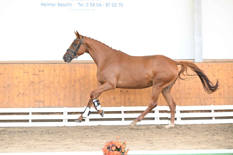 C'est une athlète très filiforme qui se présente ici, encore au début de sa formation, et qui fera certainement sa future carrière sportive en concours complet ou en saut d'obstacles. Très pratique dans ses mouvements, elle est particulièrement à l'aise sur les barres, agissant toujours avec une bonne vue d'ensemble, une bonne technique et des antérieurs rapides, de sorte que l'on peut déjà très bien s'imaginer les sauts sous le cavalier. Son père, Burma Gold xx, a été élevé par le haras d'Ammerland et a un PMG de 94 kg. Il a été, entre autres, champion des trois ans en Italie, a remporté le Premio St. Leger Italiano et a terminé deuxième du St. Le pedigree se poursuit avec le pur-sang Cavallieri xx, ancien étalon de campagne à Marbach, qui a produit une nombreuse descendance performante. Le pedigree est complété par deux héros du dressage trakehner, Hohenstein et Saint Cloud, qui confèrent à cette jument les meilleures caractéristiques de maniabilité.