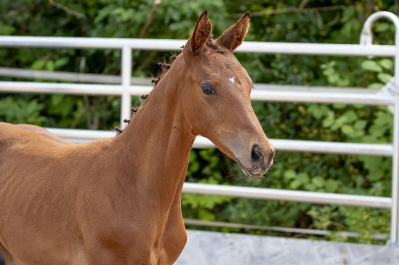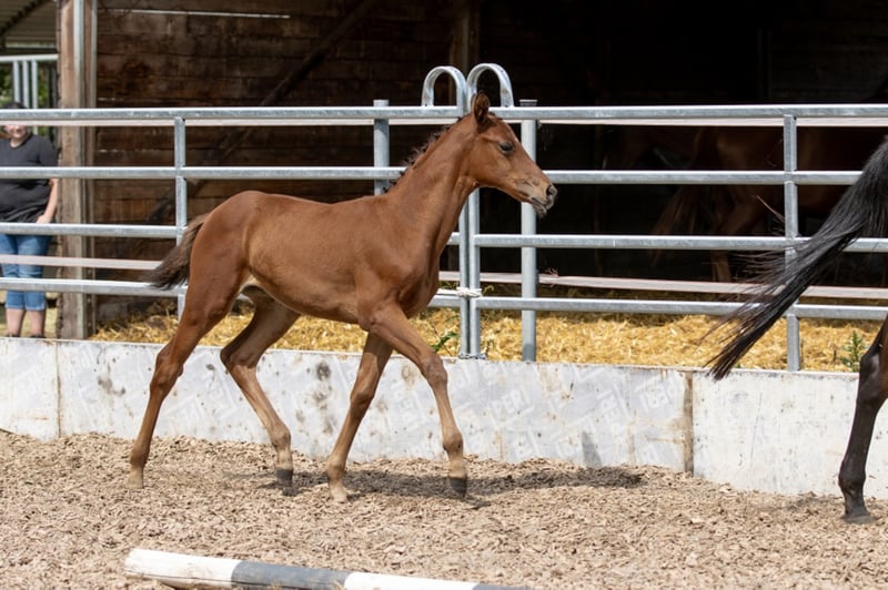 Very human-oriented, highly rated filly. Valuable pulled with a lot of blood connection, it is just as interesting for sport as it is for breeding! Curious and courageous, she is waiting for her new owner, who wants to make her a lot of fun! It is species-appropriate in the open barn in the herd and becomes regular?? ig dewormed and presented to the hoof worker. Foal rating 2021: Type 8.0 - K?rper 8.0 - Foundation 8.0 / Step 8.0 - Trot 7.5 - Gallop 8.5 / Overall impression 8.0 = 56.0 points