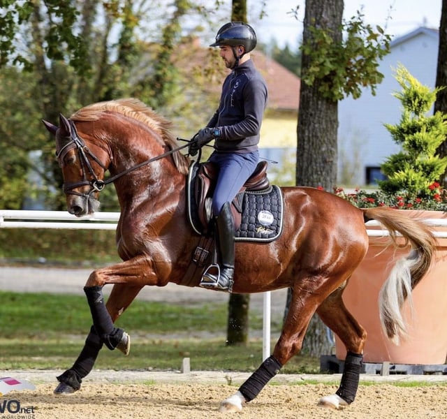 Uwaga – nowość: Hailey weźmie udział w dniu sprzedaży podczas "Riemer Pferdemontag" 10 listopada 2025 roku w Olimpia-Reithalle w Monachium-Riem. Konie wystawowe będą prezentowane od godziny 18:00, a następnie będzie można odbyć jazdę próbną. W razie pytań prosimy o kontakt z hodowcą i właścicielem R. Nagel: tel. 0160 966 30 920. Hailey to piękna, szlachetna kasztanowata klacz. Jest łatwa w jeździe (i dobrze się na niej siedzi), przyjazna i spokojna. Szukając kontaktu z ludźmi (jest przytulankowym koniem) i dobrze dogadując się z innymi końmi. Zachowuje spokój, np. podczas jazdy solo w hali lub na zewnątrz – nawet wtedy, gdy inne konie są również trenowane. W maju/czerwcu 2024 roku została lonżowana i przyzwyczajona do siodła oraz jeźdźca. Po tym wróciła na rok do stajni i na pastwisko, ponieważ jest końcem późno urodzonym. W sierpniu/wrześniu 2025 roku Hailey wzięła udział w próbie dzielności klaczy organizowanej przez Bayerischer Zuchtverband w Monachium-Riem. Otrzymała w części oceniającej ujeżdżenie ocenę 7,9! Wrażenia z testu zaufania jeźdźca: zobacz film. Oceny z prób stacyjnych m.in.: Charakter 10,0; Temperament 9,0; Chęć do pracy 9,5; Kondycja 9,0 Stan zdrowia – w doskonałej kondycji. Zdjęcia rentgenowskie z 26.08.2025: bardzo dobre, bez żadnych odchyleń! Pochodzenie Hailey: Ojciec: P.H. Karim Dorè – w wieku 6 lat zwyciężył w konkursie M-Dressur (średni poziom ujeżdżenia). (Zobacz zdjęcie w załączniku – kasztanowaty ogier) Dodatkowo jej linia pochodzi od koni Grand Prix w ujeżdżeniu: E.H. Imperio i E.H. Insterburg – najwyżej ocenianych w 2025 roku trakehnerów „Sterne”, na pierwszym i drugim miejscu. Matka: St.Pr. i Pr.St. Hetidze v.H. – wygrała konkurs M-Dressur. Do poziomu S-Dressur wytrenowana, niestety potem odniósła kontuzję, od tego czasu jest skuteczną klaczą hodowlaną. (Zobacz zdjęcie w załączniku – klacz rasy Rapp) Starsza siostra Hailey to St.Pr. i Pr.St. Hadiya, odnosząca sukcesy do poziomu S-Dressur, po Grand Prix H. Schwarzgold i tej samej matce, St.Pr. i Pr.St. Hetidze v.H. Bardzo dobre podstawowe chody Hailey (zobacz film na lonży) są obecnie rozwijane pod jeźdźcem. Hailey jest już gotowa do konkursu w klasie E-Dressur i może być w każdej chwili wypróbowana pod siodłem. W przypadku zainteresowania jazdą próbną na stajni w Waakirchen, prosimy o kontakt i umówienie terminu z jeźdźcą i instruktorem Kathrin Reisinger. Telefon: 0173 2732008. Dodatkowo jazdę próbną można odbyć w dniu sprzedaży 10 listopada 2025 roku w Olimpia-Reithalle w Monachium-Riem (uwaga – patrz wyżej).
