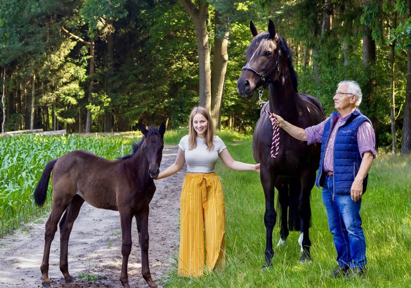 Name: Bartels Deern Geboren: 15. April 2021 Abstammung: von Dezember x Hancock x Heraldik Stutenstamm: Balbine (selten) Eingetragen im Stutbuch 1 Bartels Deern ist eine junge, typvolle Trakehnerstute mit sehr guten Grundgangarten und einem ausgeglichenen, freundlichen Wesen. Sie überzeugt durch ihre Lernfreude, ihren klaren Kopf und ihren einwandfreien Charakter. Besonders hervorzuheben ist ihre große Menschenbezogenheit und sie ist im täglichen Umgang unkompliziert und brav. Mein 83 jähriger Opa kann sie reiten, genauso wie meine 8 jährige Nichte. Sie steht aktuell in einer gemischten Herde und zeigt sich dort sozial und unproblematisch. Neue Aufgaben nimmt sie interessiert und motiviert an. Gesundheitlich ist zu erwähnen, dass sie vorne rechts eine Fehlstellung hat und daher derzeit Eisen trägt. Zudem besteht hinten rechts ein kleiner Schaden an der Strecksehne, der sie aktuell nicht weiter einschränkt. Aktuell liegen keine Röntgenbilder vor. Bartels Deern eignet sich ideal für jemanden, der eine junge, charakterstarke Stute mit solider Abstammung und Entwicklungspotenzial sucht. Weitere Informationen gern per WhatsApp unter 01515 8434799.