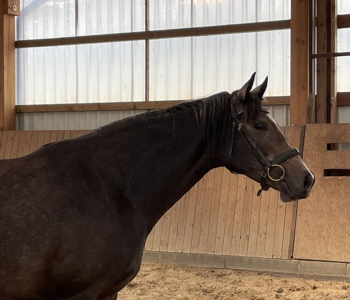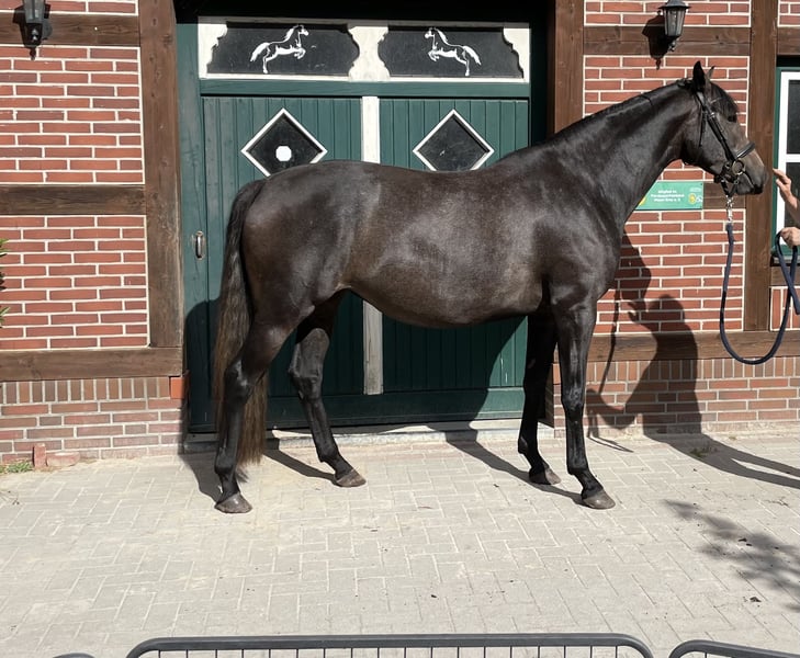 This young mare combines dressage potential, versatility talent, and an excellent pedigree. Clear in her mind, strong in her movement - a true prospect for sport and breeding. She is ready for her role as a riding horse, absolutely cool and affectionate, she will become a great partner for sport, leisure, and breeding. She has already started with light work. Her father passes on his traits decisively, alongside top character, very good rideability, and nerve strength, of course, also very good gaits and jumping ability. Her mother is a premium mare with racing performance and produced her first foal, which was immediately awarded. Two other full siblings have been awarded the highest premium of their year. Thus, she is also a highly interesting future breeding mare!