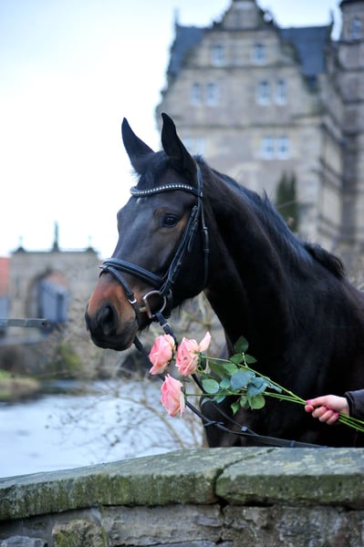 The 3-year-old Valentiana is a very athletic young mare with a lot of leg, big parts, three very tactful and good basic gaits. At the jump she shows a lot of overview, joy, ability and manner. Equipped with a wonderful interior! She is already convincing with a lot of rhythm and her fine, light manner under the rider. We ride our young horses very calmly and deliberately avoid an exciting performance. Her sire His Moment was the champion stallion at the Trakehner licensing and is the sire of three licensed stallions and various champion mares. His offspring also excel in sport. Her dam Valentine is a very modern daughter of the short Grand Prix successful elite stallion TSF High Motion and granddaughter of the multiple Grand Prix and Grand Prix Special successful Showmaster. Valentine has since produced several highly decorated foals at foal shows. She is a half-sister to the successful advanced (S) level dressage stallion Valpiano and the premium mares Vittoria, Veruschka, Vitalia I and II and Valenta. The Hämelschenburg mare family of Vilja by Julmond includes the proven sires Van Deyk (Grand Prix), Vincent, Valerian (HLP winner, advanced (S) level dressage, eventing) and Velasquez (medium (M) level show jumping) as well as Peter Thomsen's World Championship eventing horse Vilano.