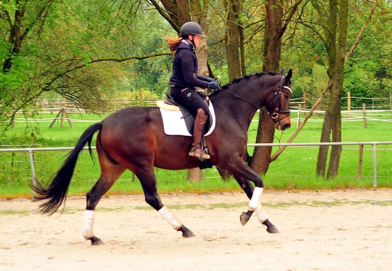 Die 5jährige Prämienstute Valentiana ist eine sportlich geprägte Stute mit viel Bein, großen Partien, drei sehr taktsicheren und guten Grundgangarten. Sie überzeugt durch ihre hohe Rittigkeit und ein feines Sitzgefühl. Aktuell hoch platziert in Reitpferdeprüfungen WN 8,0! sowie in Dressurpferdeprüfung Kl. A. Ihre Stutenleistungsprüfung legte sie mit der höchsten Rittigkeitsnote des Starterfeldes ab. Beim Freispringen zeigt sie Übersicht, Freude, Vermögen und Manier. Sie hat ein wunderbares Interieur, ist sehr angenehm zu reiten - sehr zuverlässig und auch im Gelände fein zu reiten. Ein Pferd mit dem SIE viel Freude haben werden! Wir reiten unsere jungen Pferde in Ruhe an und verzichten bewusst auf eine spannige Vorstellung. Ihr Vater His Moment war Siegerhengst der Trakehner Körung und ist Vater von drei gekörten Hengsten sowie diversen Siegerstuten. Auch im Sport brillieren seine Nachkommen. Ihre Mutter Valentine ist eine sehr modern aufgemachte Tochter des Kurz Grand Prix erfolgreichen Elitehengstes TSF High Motion und Enkelin des vielfach Grand Prix und Grand Prix Special erfolgreichen Showmaster. Valentine stellte inzwischen mehrfach hoch dekorierte Fohlen auf den Fohlenschauen. Sie ist eine Halbschwester des S-Dressur erfolgreichen Valpiano sowie der Prämienstuten Vittoria, Veruschka, Vitalia I u. II und Valenta. Aus der Hämelschenburger Stutenfamilie der Vilja von Julmond stammen die bewährten Vererber Van Deyk (Grand Prix), Vincent, Valerian (HLP Sieger, Dressur Kl. S, Vielseitigkeit) und Velasquez (Spr. Kl. M) sowie Peter Thomsens WM Vielseitigkeitspferd Vilano.