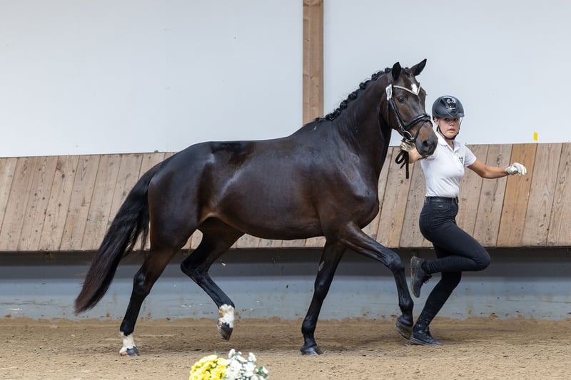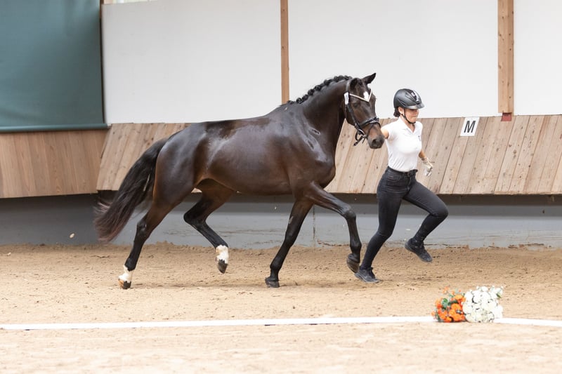 A few weeks ago, Hillery successfully completed the central mare registration and her performance test with exemplary form and confident appearances, resulting in the title: PREMIUM MARE! During the registration, she particularly impressed with her type and nobility, a well-shaped, harmonious conformation, consistently good basic gaits, and especially an outstanding walk, and she also excelled in her performance test with an excellent evaluation of her jumping ability. In this regard, she follows in the footsteps of her mother Helena, who was rated highly and received top marks in all criteria and also completed a first-class performance test. Hillery is one of the very few daughters of the sportily distinguished premium stallion Grappa Nero. The maternal lineage has been nurtured in this breeding establishment for generations and presents a pedigree combination that is both sportingly and breeding-wise high-quality, connecting the successful dressage sires Hohenstein and Latimer with the founding sire Arogno.