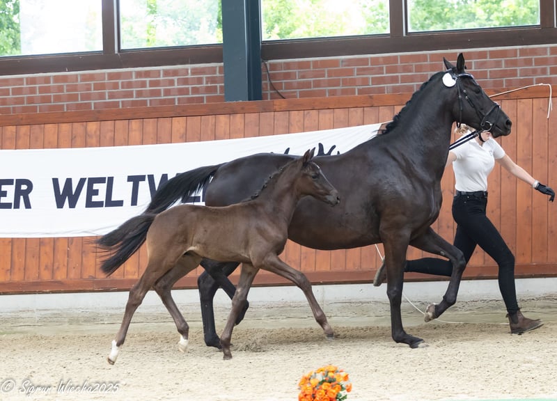 Highly anticipated, the stallion debut of the premium stallion Zauberdesign - so convincing and impressive, he celebrated his athletic performances at a young age! With his son born in April, this debut is a perfect start! Male-noble, in dignified self-carriage and striking in the elegance of his body at significant parts, he moves off the spot effectively, light-footed, and with the required power development! A colt with all the talents for further studies on a supportive path! His highly decorated mother carries the legacy of the great Millennium, as well as that of her mother, who once stood in the spotlight as the winning mare at the Central Mare Registration. From a top lineage with great achievements in all athletic fields.