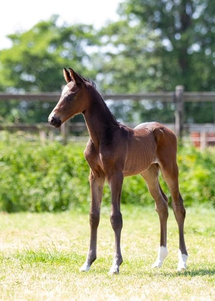 Dieses schöne Hengstfohlen, geboren am 12. Mai, wurde auf der Körung mit Prämie ausgezeichnet und für die Fohlenmeisterschaft West in Deutschland eingeladen mit folgenden Punkten: 8 – 7.5 – 7.5 / 8 – 7.5 – 8 / 7.5 = 54. Die Mutter H'indy (v. Hirtentanz) ist Elite und hat M Eventing und PSG Dressur geritten. (Siehe aktuellen Artikel auf Facebook Trakehner Rheinland). Der Vater ist der bekannte Elitehengst Millennium. Beide Großväter sind ebenfalls Elite und 4 von 8 Vorfahren sind das auch. Wie auf der Körung gesagt wurde: „eine seltene elitäre Abstammung dieses schönen Fohlens mit zusätzlichem Bewegungsvermögen. Die Kombination all dieser Gene hat ein sehr sportliches, gutes Fohlen hervorgebracht. Ein ansprechendes Fohlen mit guten Verbindungen, das gerne und gut bewegt. Ein guter, raumgreifender Schritt und ein schöner, untergesprungener Galopp mit stolzer Ausstrahlung und einem korrekten Fundament.“ Die Hengste Millennium, Easy Game und Gribaldi bedürfen keiner zusätzlichen Erläuterung bezüglich ihrer sportlichen Leistungen, aber auch in der Mutterlinie steckt viel Sport, neben der Mutter auch verschiedene Pferde im Subtop: (siehe https://www.horsetelex.nl/horses/pedigree/2687995/havanarivo). Das Fohlen ist gut erzogen und hat einen ruhigen, intelligenten und kooperativen Charakter. Regelmäßig entwurmt und vom Schmied begutachtet, der übrigens nichts tun musste aufgrund des korrekten Fundaments und der Härte der Hufe. Das Fohlen hat einen zusätzlichen Takt im Trab und wird bald ein dunkles Fell bekommen, das so charakteristisch für Millennium-Abstammungen ist. Das Fohlen kann nach dem Absetzen eventuell vor Ort in die Aufzucht bleiben.