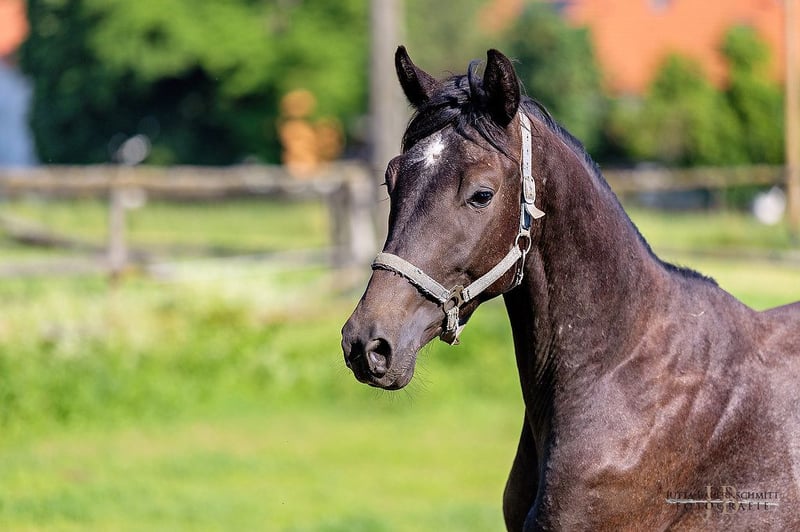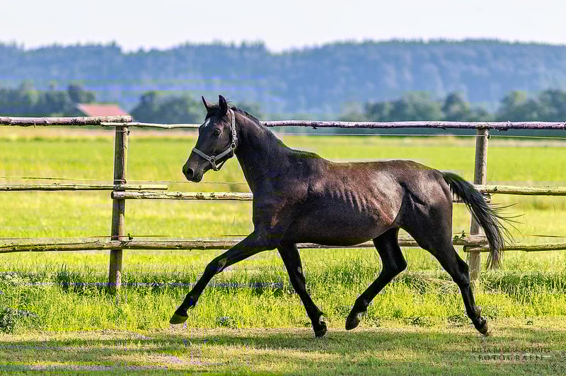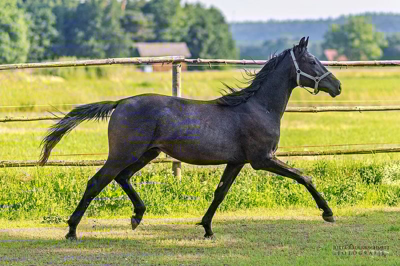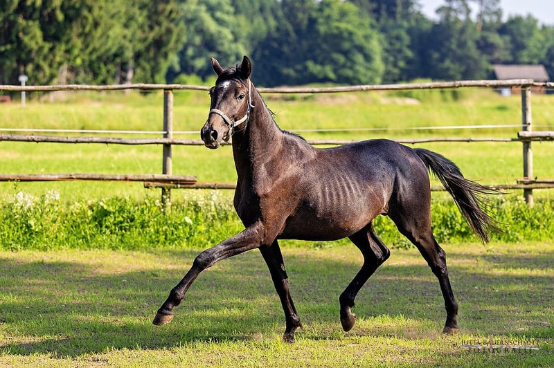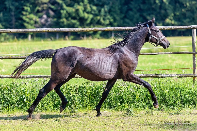 Zum Verkauf steht ein sehr bewegungsstarker Rappschimmelhengst von Janov (EH Heuberger/Normativ ox) a.d. Kreta (EH Connery/Lehndorff's). Bei seiner Fohlenbewertung konnte dieser typvolle Youngster bereits punkten und erhielt in Summe 57,5 Pkt. v. damaligen ZL Lars Gehrmann. Derzeit wächst er in profigerechter Hengstaufzucht mit gleichaltrigen in der Herde auf. Vater Janov ist erfolgreich bis Dressur S**; seine Mutter kann Erfolge in D/S/G bis Kl. L aufweisen. Dieser Youngster wird sicherlich später im Dressurviereck glänzen. Väterliche Geschwister bereits erfolgreich im Turniersport. Verkauf direkt vom Züchter https://trakehnerzucht-renate-steiner.de/konrad-s/ Bilder und Video aktuell von Ende Juni 2025