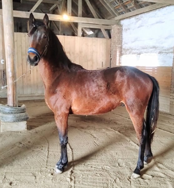 This stunning young stallion is looking for his forever home. He was born on June 25, 2023, and is currently approximately 1.55 meters tall. He has incredibly long legs and already boasts a thick mane and tail. A show-off with style and endless charm, he knows how to make a statement to attract all eyes. With his big eyes and sweet expression, he captivates everyone he meets. He is expected to reach a final height of around 1.65 meters and has great potential for more demanding tasks. Already exhibiting impressive movement, a lively and floating trot, and a calm, uphill canter, he impresses at this early stage. A very confident young gentleman with a strong presence. He is already lunged at the halter, walks over a tarp, and enjoys jumping over a cavaletti. He is well-versed in basic foal training, regularly dewormed and vaccinated, and very social with other horses. This young stallion shows hardly any typical stallion behavior, is well-mannered, and knows how to behave. Experience in handling stallions or young horses should be sufficient. With the right partner by his side, a career in sport could certainly be possible. The parent horses can be viewed on site. He comes with a passport and pedigree documentation. We have a few videos, but they hardly do justice to his excellent gaits. Visiting and falling in love with him is the motto. A viewing appointment can be arranged, with a €15 fee for the introduction in the paddock, which will be deducted from the purchase price. We also have horses with various training levels available at the farm. If you're interested, please get in touch.