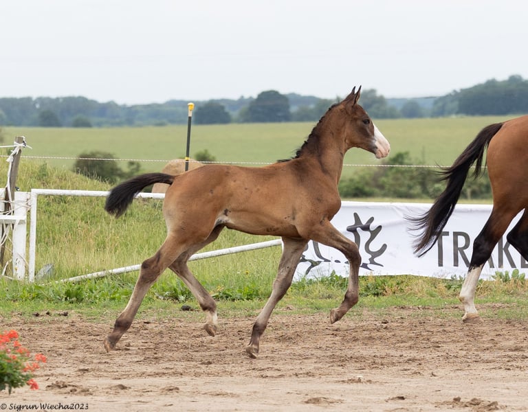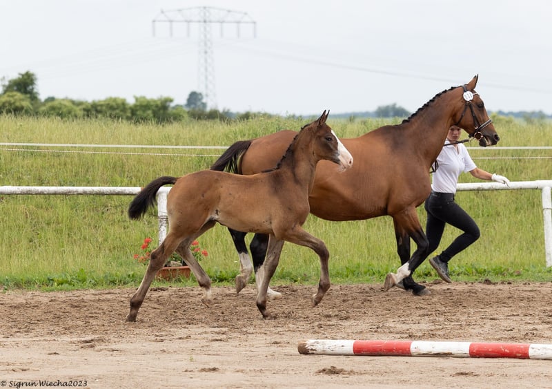 With chic, charm and clear self-confidence, this young man not only impressed the commission on the occasion of his registration. The effectively supported basic gaits are characterized by rhythm, power and cadence. The compact physique, characterized by its jumping genetics, impresses with a harmonious tripartite division with generously laid out shoulder and croup formation. The well-set neck, with enough attachment, embodies a clear stallion candidate in the overall appearance. The correct foundation is provided with large and clearly defined joints. Sire Göteborg is the last representative of the valuable stallion line of Cancara and was himself successful up to medium level. The high-quality mother St.Pr.u.Pr.St. Zaubernixe is one of the best daughters of her sire E.H. Hirtentanz, who won the S-level show jumping, and received top marks for free jumping on the occasion of her performance test. The full sister received applause at the Free Jumping Cup at the Trakehner Stallion Market. The very small mare family of the Magic Fairy has its origins in the breeder's house of the von Schöning family and is a guarantee for motivation. This is how the sport horses Zauberdeyk, Zauberruf and St.Pr.u.Pr.St, which are successful in the S-Class, originate. Magic Witch, Magic Wand, the former Vice Federal Champion Zauberfürst as well as the Federal Champion and participant in the World Championships for Young Dressage Horses Pr.u.E.St. cicada of this mare line. About the grandmother St.Pr.u.Pr.St. Sorcerer's Witch, the consolidation takes place on the second production line, which is maintained by the von Schöning family for generations there. The grandfather E.H. Herzruf, who was trained in dressage up to the highest level, stands for motivation, rideability and a person-oriented character. He passed his stallion performance test with a final result that was unattainable at the time, where top marks were also awarded in the jumping sub-index. The dam St.Pr.,Pr.u.E.St. Herzchen has been highly endowed many times at DLG shows and riding horse championships and is one of the top mares in this population. She produced numerous daughters who were also highly awarded under saddle. The combination of many relatives who are successful in show jumping up to advanced level (S) level makes this young stallion a particularly interesting stallion candidate in terms of genetics.