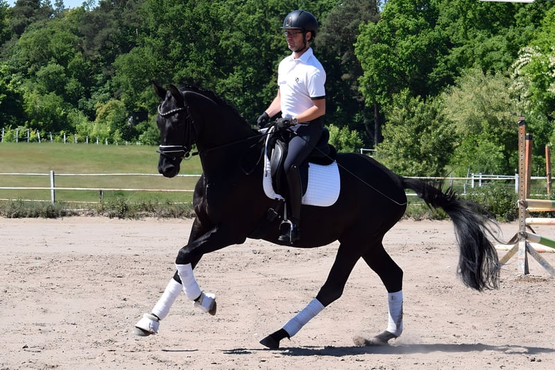 For sale is a charming gelding with a dark coat and three very good basic gaits. His walk and canter are particularly impressive. He is easy to handle and gets along well with children, dogs, and other horses. He has also completed lunging sessions with children and beginners in the saddle. In free jumping, he demonstrates talent and is familiar with work over Cavaletti. A veterinary health certificate, including back and neck examination, is available. Due to an X-ray finding, the gelding is offered at a significantly reduced price.