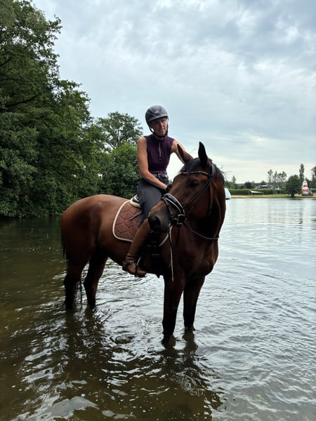 Dontucky impresses with his excellent rideability, good gaits, and wonderful temperament. He is always motivated and eager to please his rider, whether in the arena, on trail rides, or in handling. He has completed all L-level dressage tests and shows talent in lateral movements. As a foal, he was Reserve Champion and received 9s for type and trot. He remains in the possession of his breeder and has been trained in a versatile and gentle manner. If you are looking for a well-trained horse with an outstanding character and all the sporting potential, you should get to know Dontucky. He will only be placed in the best hands that can provide him with a horse-friendly life.