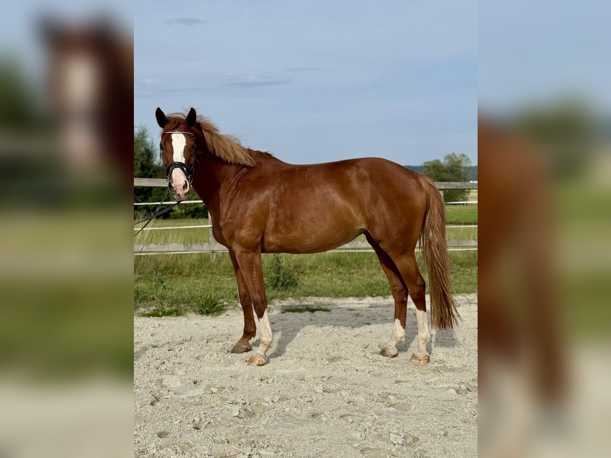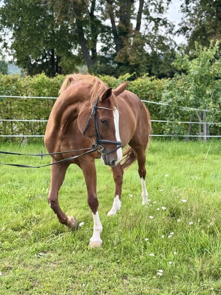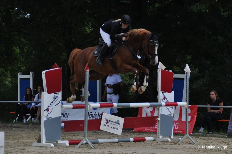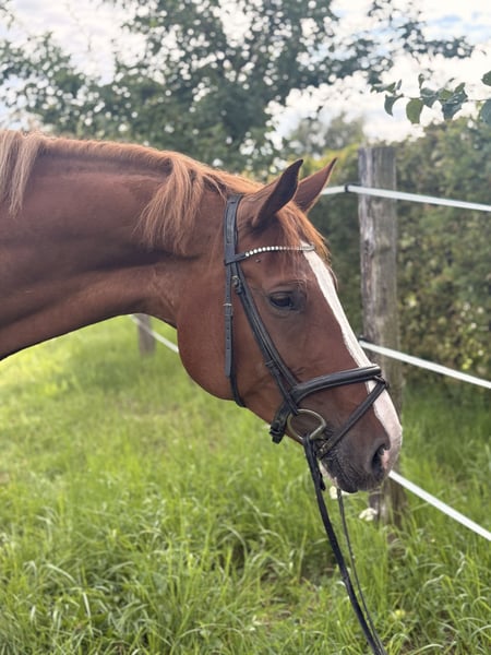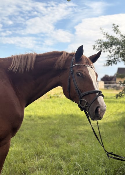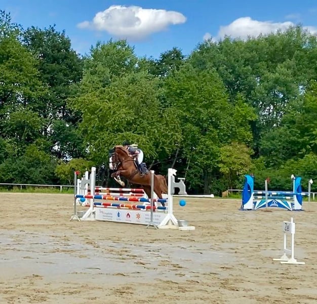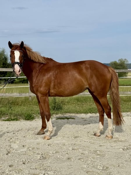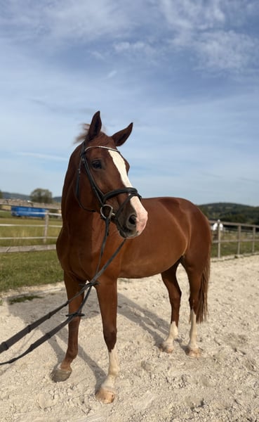 Beautiful chestnut mare named Adelheid, born in 2016, approximately 16.1 hands tall. Sire: All Music (by Arpeggio), Dam: by Hogwart. She has placed at the 1.40m show jumping level but has been primarily ridden for leisure in dressage and jumping recently, due to her retirement from competitive sport. She is unspoiled and in excellent condition. She enjoys jumping very much and has a lot of talent at the fences. With a few training sessions, she could quickly return to competition. Adelheid is very affectionate and loves cuddling, but during riding, she requires a confident, experienced rider, as she can sometimes be a bit stubborn. She has a very good conformation. She has a calm disposition and is easy to keep in contact with. Not a typical children's horse, but an enjoyable ride for a competent advanced rider. We purchased her as a foal from the breeder. She has been ridden by amateurs and is very well trained. Serious inquiries only, please. Adelheid is for sale and not available for loan. Upon request, I can send videos. She is being offered due to lack of time and her retirement from competition. Current jumping training videos available.